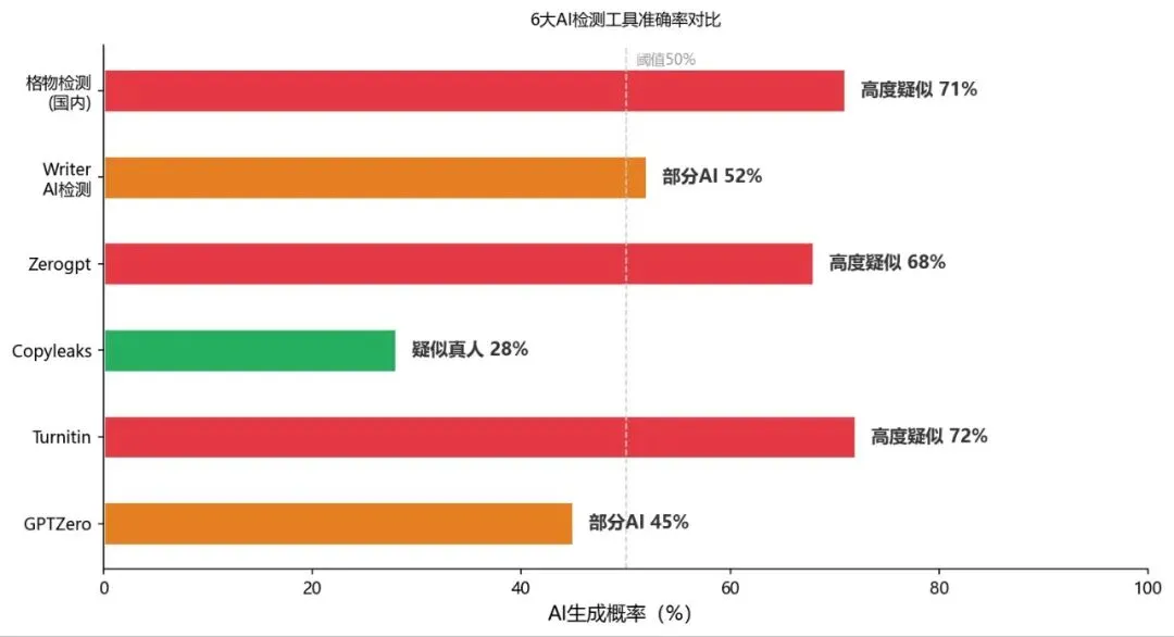 我把同一篇文章丢进了六个主流检测平台,结果很有意思: