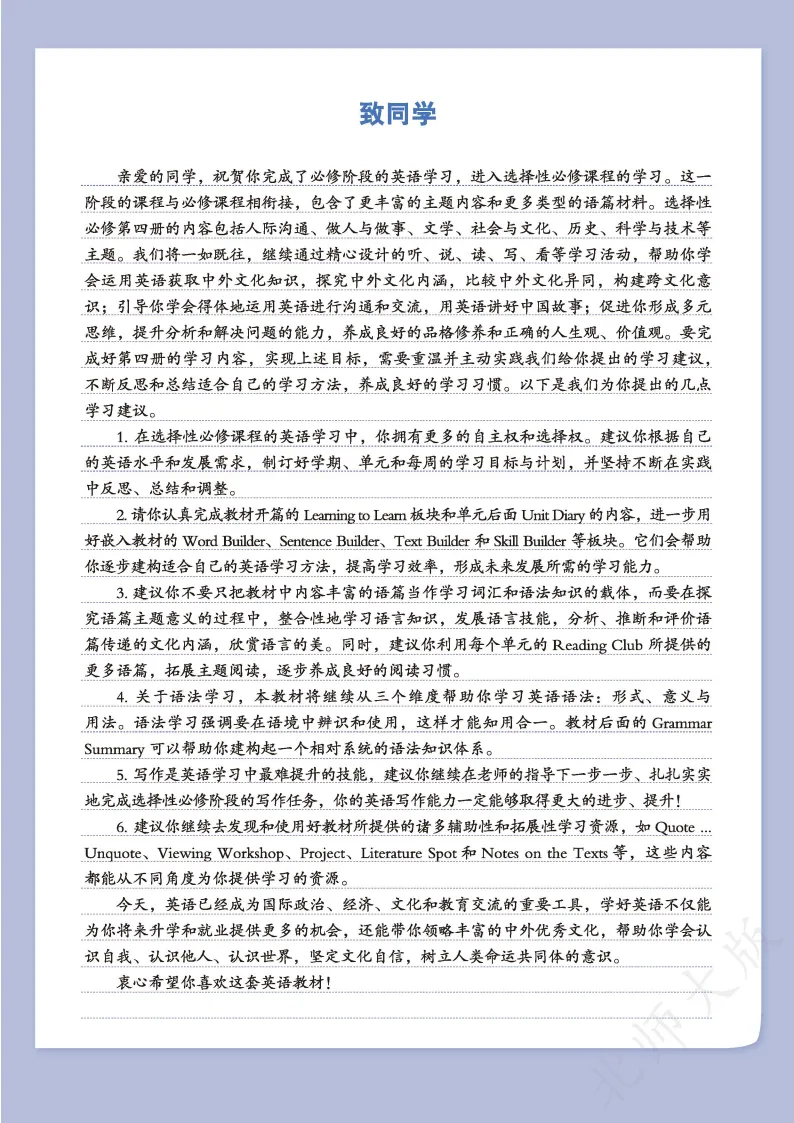 今天给大家分享的是:新版教材高中英语选择性必修第四册(北师大版)电子课本已更新(彩色高清PDF,可打印)。完整电子版文章末尾可直接领取,无套路,欢迎收藏和下载。