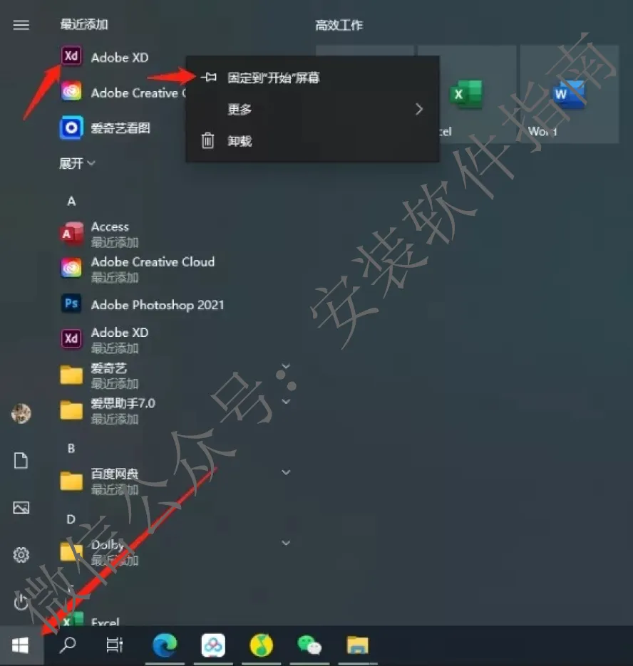 7.点击左下角的微软图标找到对应的软件固定到开始屏幕