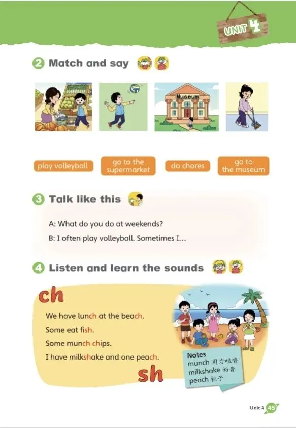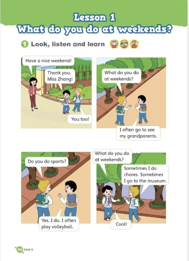 课文翻译UNIT 4 Weekend activities 第四单元 周末活动Lesson 1 What do you do at weekends? 第一课 你周末做什么?①Look, listen and learn 看一看,听一听,学一学Have a nice weekend! 周末愉快!Thank you, Miss Zhang! 谢谢张老师!You too! 您也是!What do you do at weekends? 你周末做什么?I often go to see my grandparents. 我经常去看望我的祖父母。Do you do sports? 你做运动吗?Yes, I do. I often play volleyball. 是的,我做。我经常打排球。What do you do at weekends? 你周末做什么?Sometimes I do chores. Sometimes I go to the museum. 有时候我做家务。有时候我去博物馆。Cool! 太酷了!②Match and say 连一连,说一说Museum 博物馆;play volleyball 打排球;go to the supermarket 去超市;do chores 做家务;go to the museum 去博物馆③Talk like this 仿照示例说一说A: What do you do at weekends? A:你周末做什么?B: I often play volleyball. Sometimes I… B:我经常打排球。有时候我……④Listen and learn the sounds 听一听,学读音We have lunch at the beach. 我们在海滩吃午饭。Some eat fish. 有些人吃鱼。Some munch chips. 有些人用力嚼炸薯条。I have milkshake and one peach. 我喝了奶昔,还吃了一个桃子。