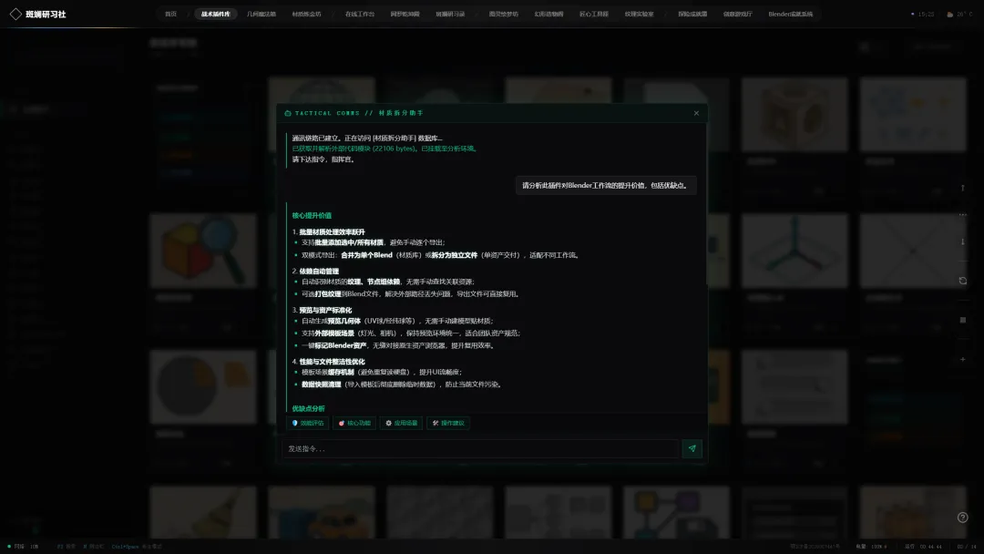 你可以直接让它输出“效能评估”、“核心应用场景”或是“Blender 操作最佳实践”。它将以极简的极客指令风格,为你剥丝抽茧,告别长篇大论的废话。