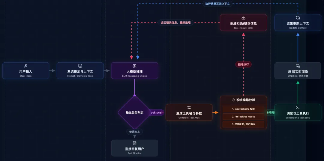 但接下来是不是能执行、以什么顺序执行、是否需要用户确认、能不能并发、结果怎么回流上下文,这些事情都已经不再由模型说了算,而是进入了框架的编排链路。