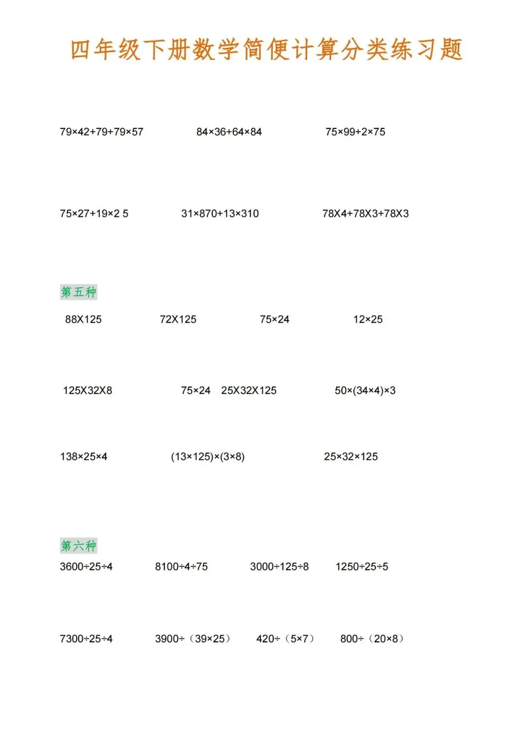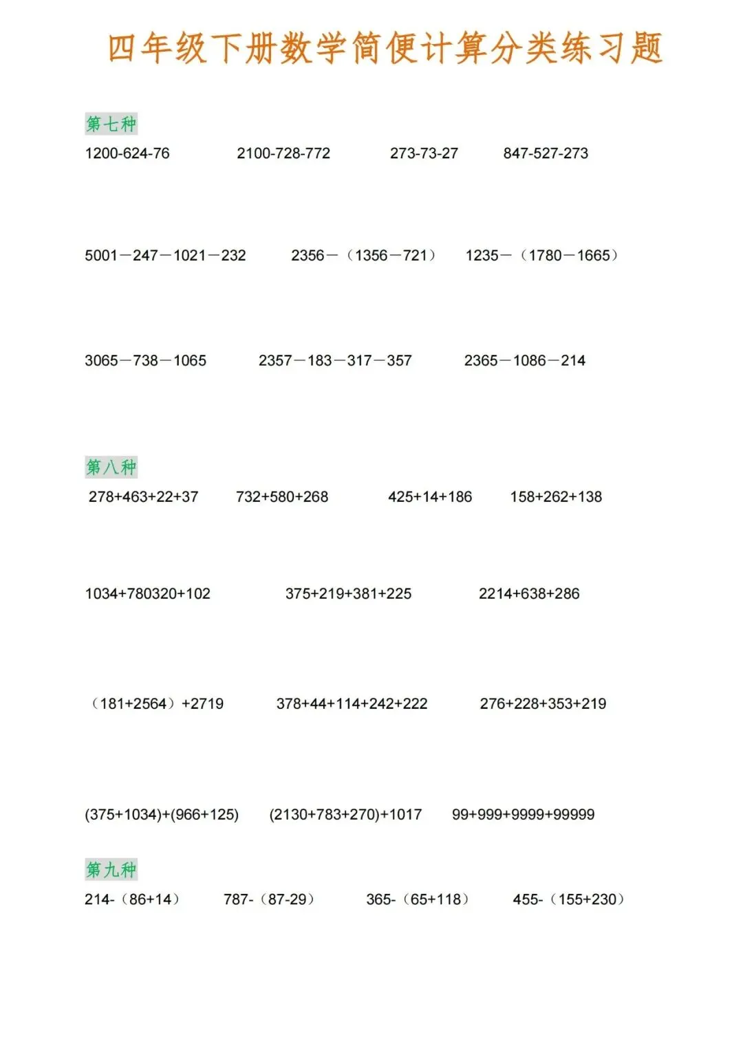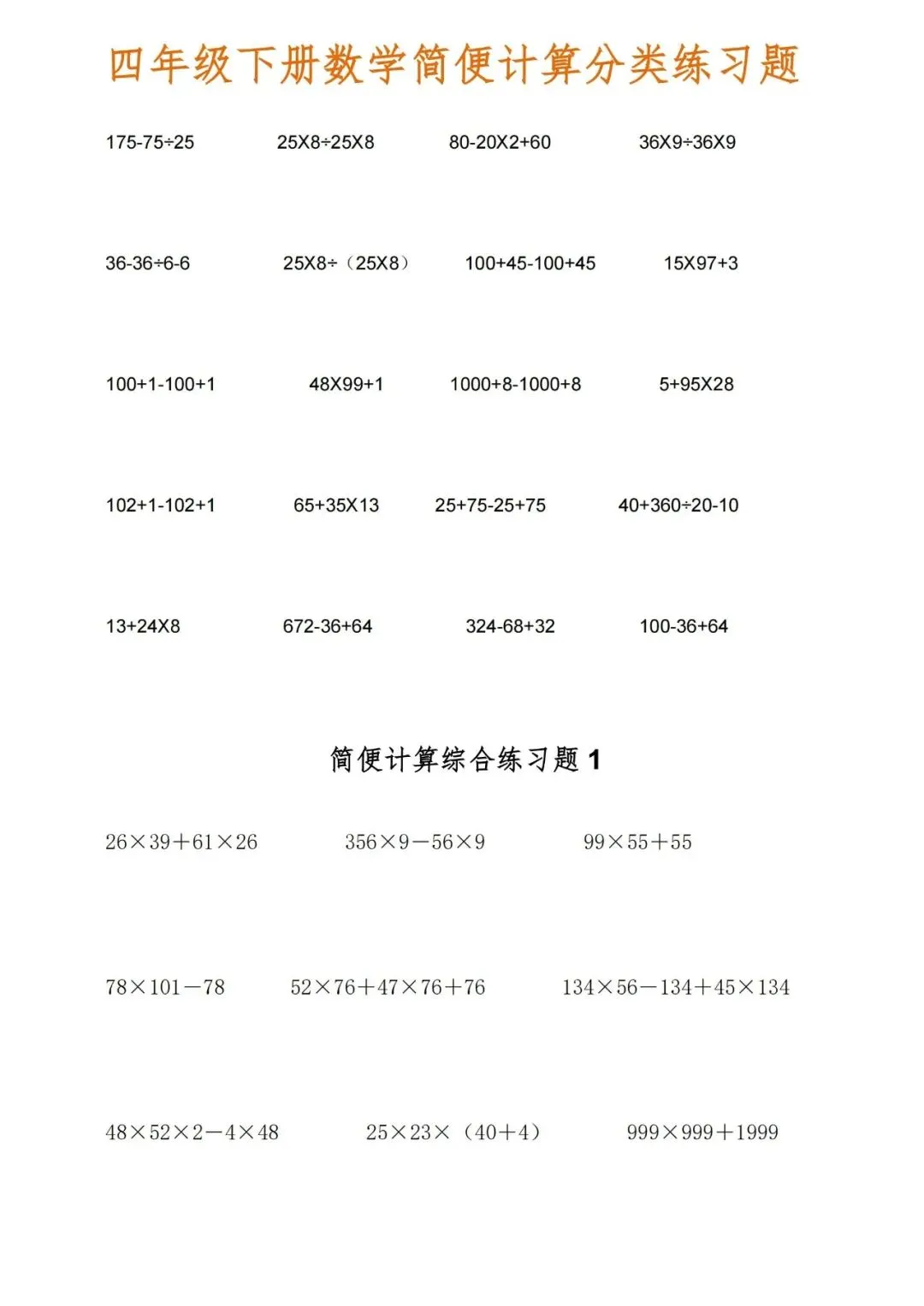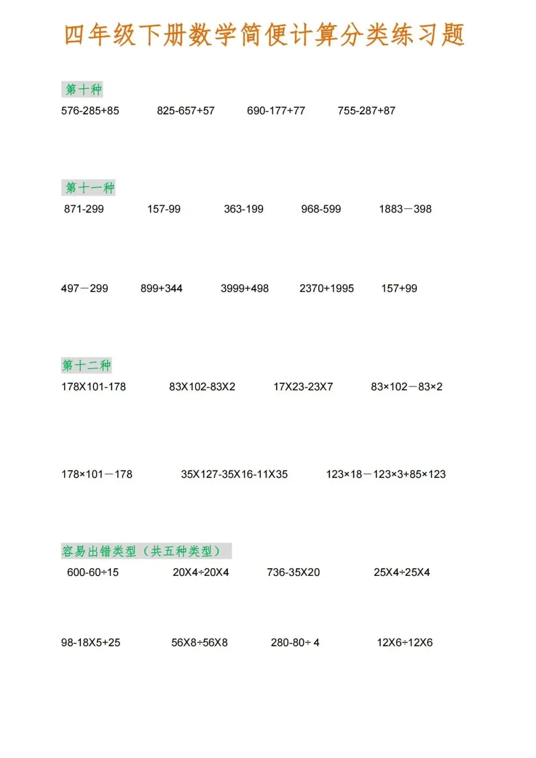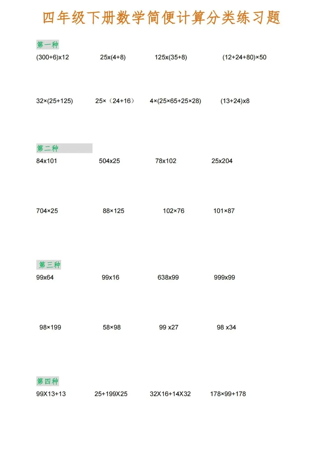 26年春年四年级数学下册简便计算分类,电子版可打印