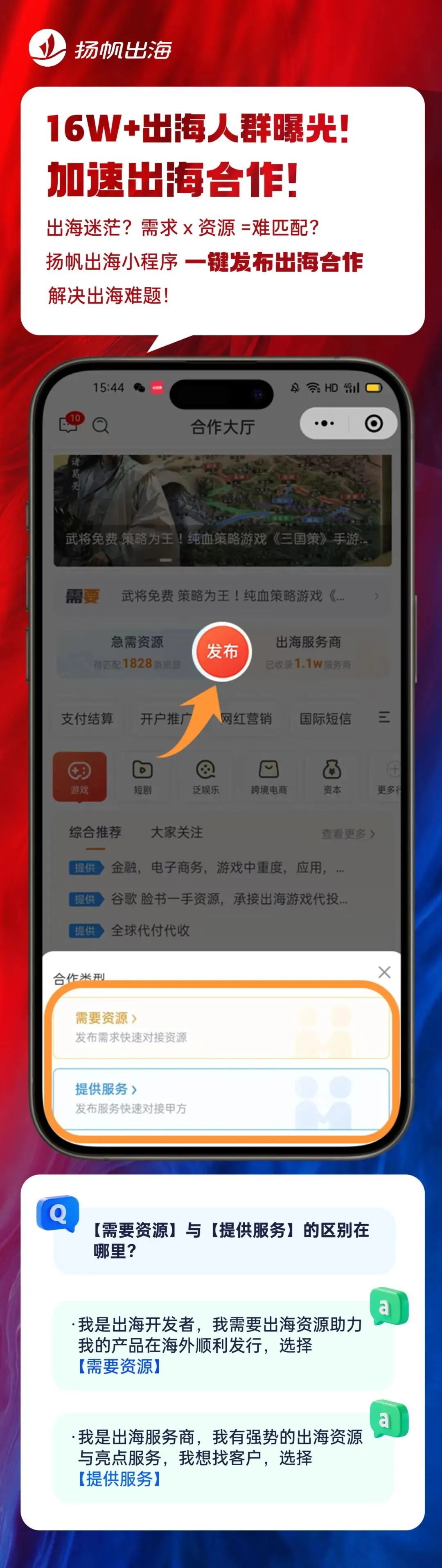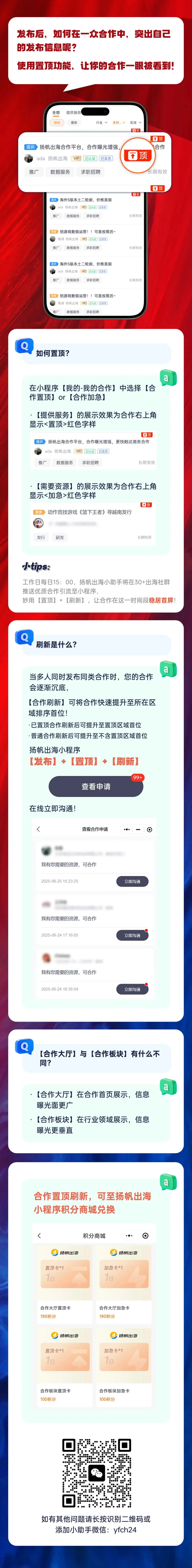 在小程序上,圈内小伙伴们每周发布了超过百条的合作信息。我们每周为大家筛选一些优质合作,帮助大家获取各类出海商机。小程序背后,我们还有上百个社群,10万+高活跃核心用户,可以将合作需求以几何级的倍速放大声量,帮助大家找到靠谱的合作伙伴。欢迎大家来扬帆出海小程序放大自己的需求声量,快速实现对接。