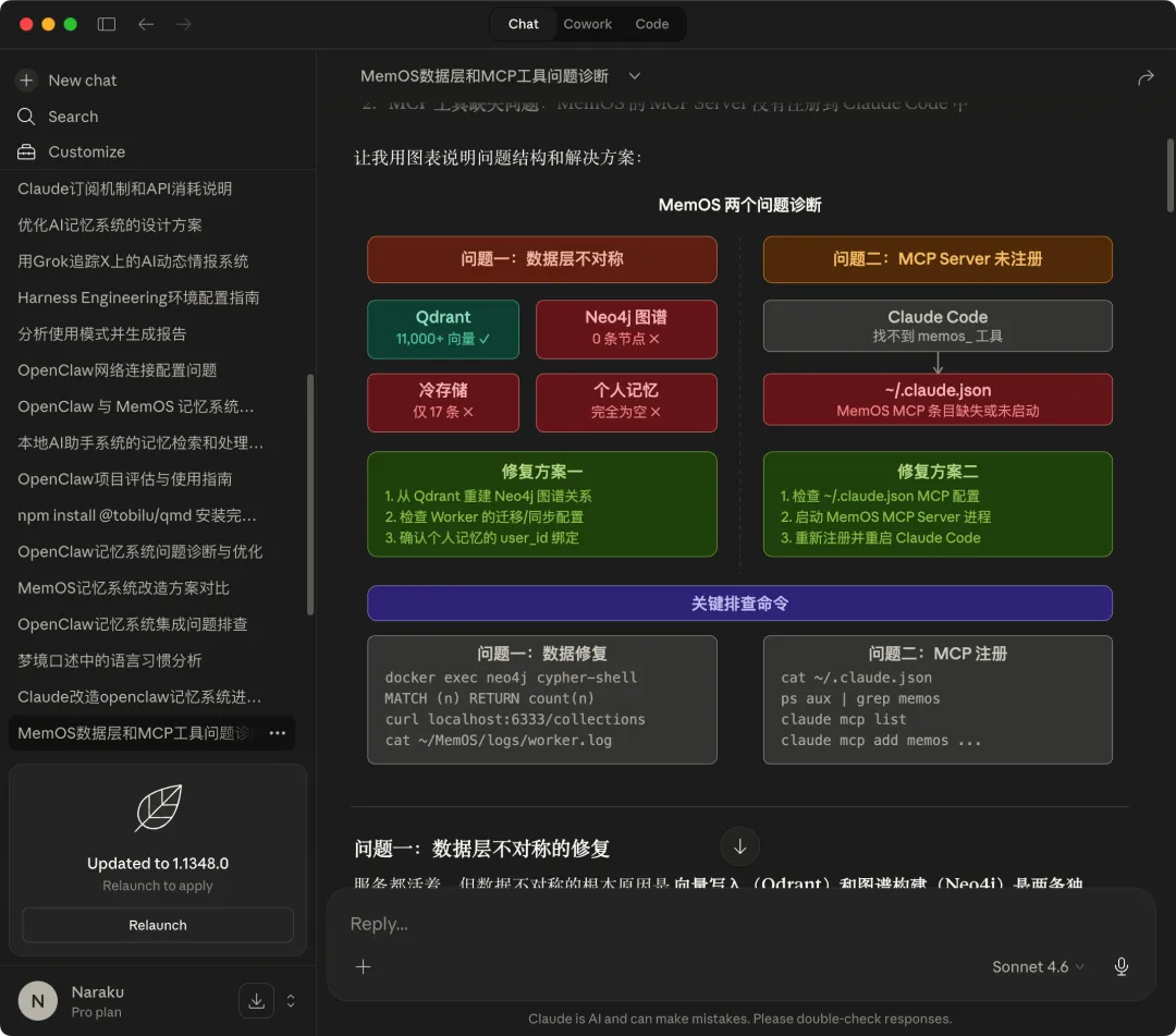 MCP的记忆查询问题:MemOS 的记忆查询要通过 MCP Server 进行,但 MCP Server 没有常驻机制,每次开新会话都要手动检查有没有在跑。有时候服务跑起来了,但进程没了,重启后还得重新导入配置。