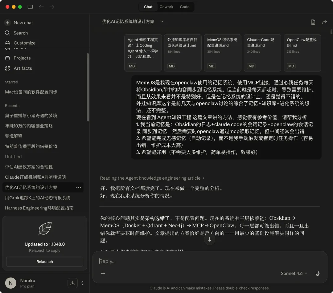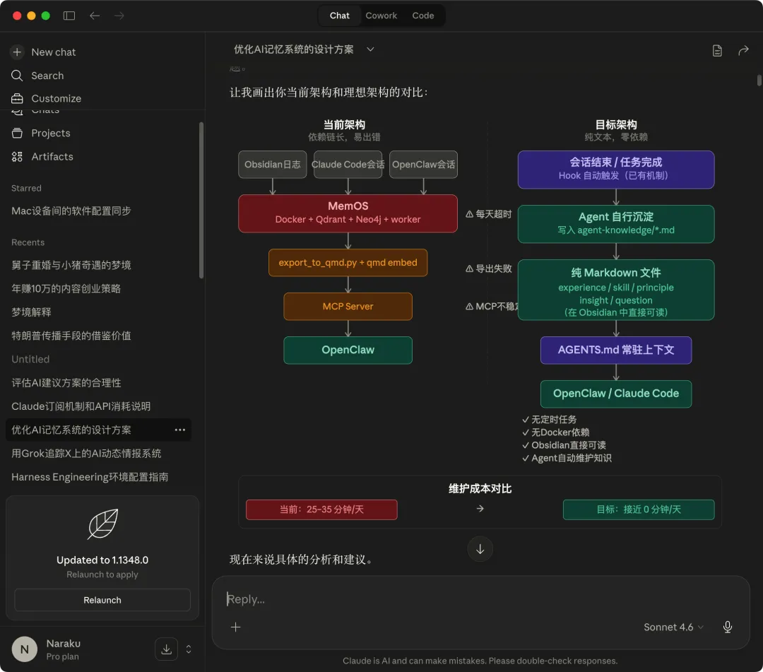 日记更新的问题:我每天都在Obsidian里写日记 ,每次对话也有新的输出。谁来读这些内容?谁来判断哪些是偏好、哪些是知识沉淀、哪些是流水账、哪些值得长期保留?没有这套机制,记忆库就会慢慢过期。
