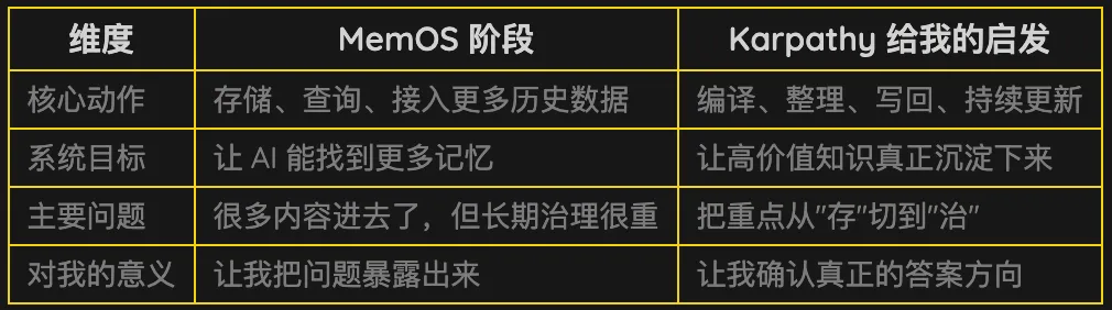 问题是:高价值信息有没有被持续整理、持续更新、持续写回。如果没有,记忆再多,也很可能只是堆在那里。每次你问问题,系统还是临时去抓一点材料拼一下。真正重要的经验、判断、方法和长期有效的结论,仍然会散在各种聊天和日志里消失掉。