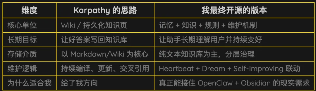 好答案不应该消失在对话里。高价值内容应该进入知识库。系统的重点不是一遍遍检索,而是持续维护一个能被调用、能被更新、能被交叉引用的长期结构。