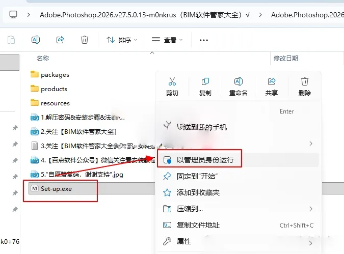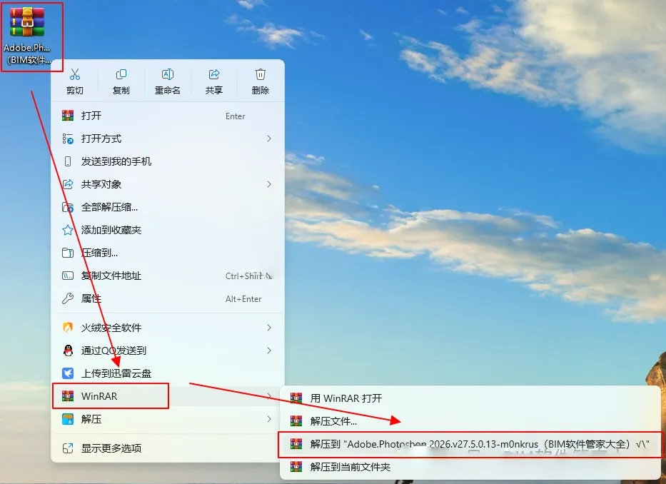1、鼠标右键选择下载好的安装包【Adobe Photoshop 2026 v27.5.0.13-m0nkrus(Ps2026)】,然后选择【解压到“Adobe Photoshop 2026 v27.5.0.13-m0nkrus(Ps2026)”】进行解压。(下载软件安装包之前务必将杀毒软件以及防火墙关闭,避免将破解补丁或注册机删除)
