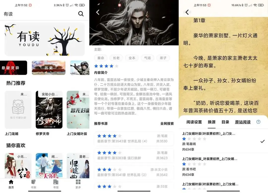有读可以免费看全网的小说,对爱看小说的你来说一定要收,因为资源真的很丰富,一键搜索全网的书籍,所有的都是免费的,且无任何的广告,搜索点击之后自动的加入书库帮你管理,除了小说之外还有出版书籍以及自传等都是买房内的,智能的识别各个网站的小说目录与内容,帮你按照完结以及资源的丰富度推送。