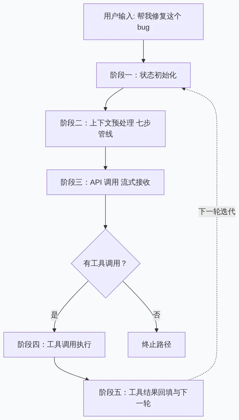 阶段一:状态初始化 阶段二:上下文预处理(七步管线) 阶段三:API 调用(流式接收) 阶段四:工具执行(按需) 阶段五:结果回填 → 下一轮 ↑________________________|