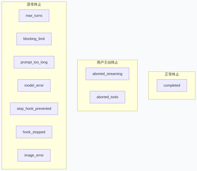 十种终止原因的精细划分不是过度设计。在调试 Agent 行为时,准确的终止原因是定位问题的第一线索。 如果所有错误都返回一个笼统的”error”,开发者将无从判断是 API 超时、上下文溢出还是用户中断导致了问题——而这三种情况的处理方式完全不同。细粒度的终止类型是可观测性(Observability)的基础。