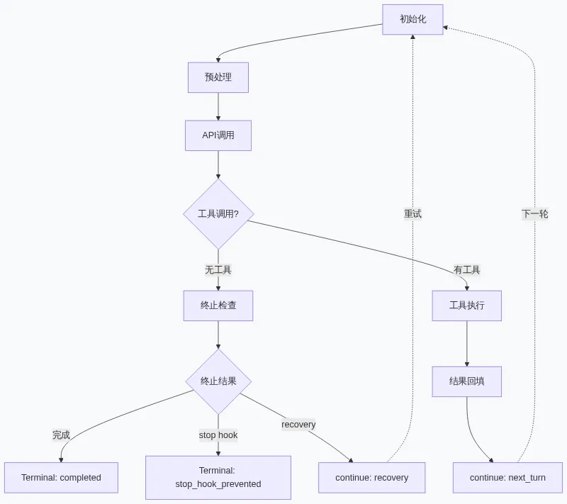 State(当前迭代状态) ↓ 预处理 ↓ API 调用 ↓ 工具执行 ↓ [Terminal] ← 十种终止路径中的任意一种 或 [Continue] → 新 State(七条 Continue 路径之一) 包含:transition 字段(记录本次 continue 的原因)
