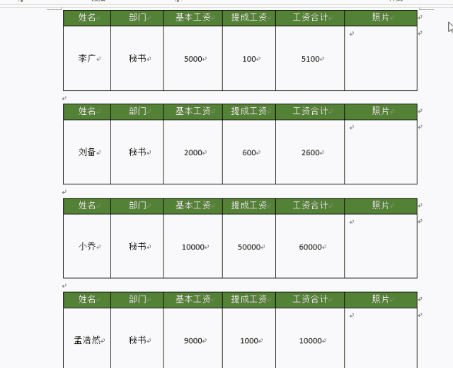 兰色说:工资条带照片不一定实用,但word中批量插入照片却是很牛×的技巧,比如制作员工卡片等。