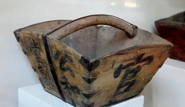 这只木提斗一看就有年头,木板拼起来,上面安个弯把手,写着旧字。它以前常用来装粮食、蔬菜,或者赶集时装杂货,提着走很稳当。