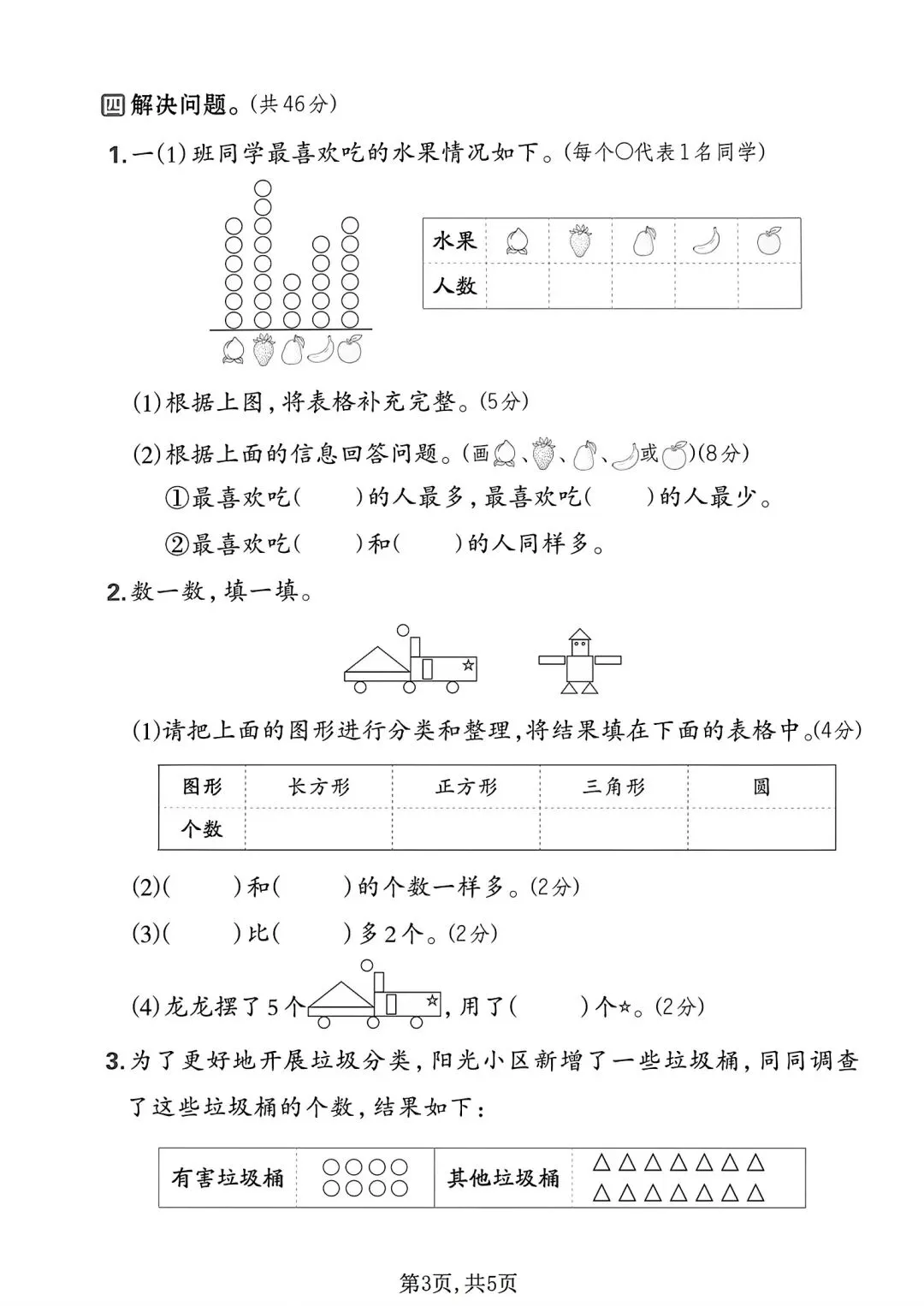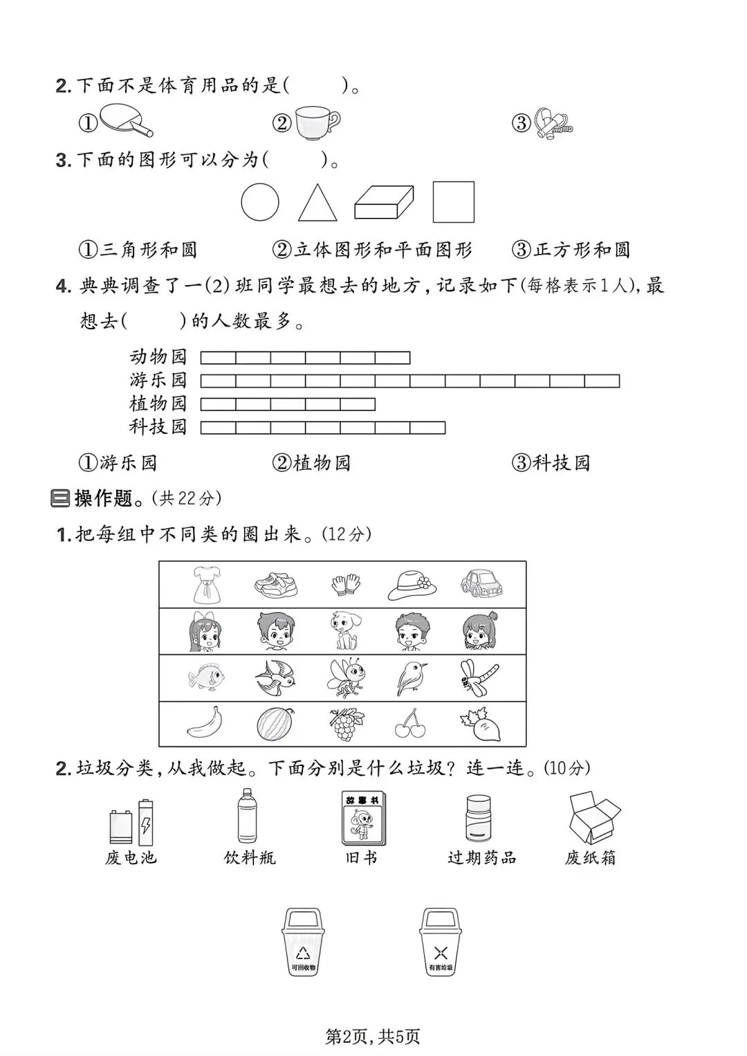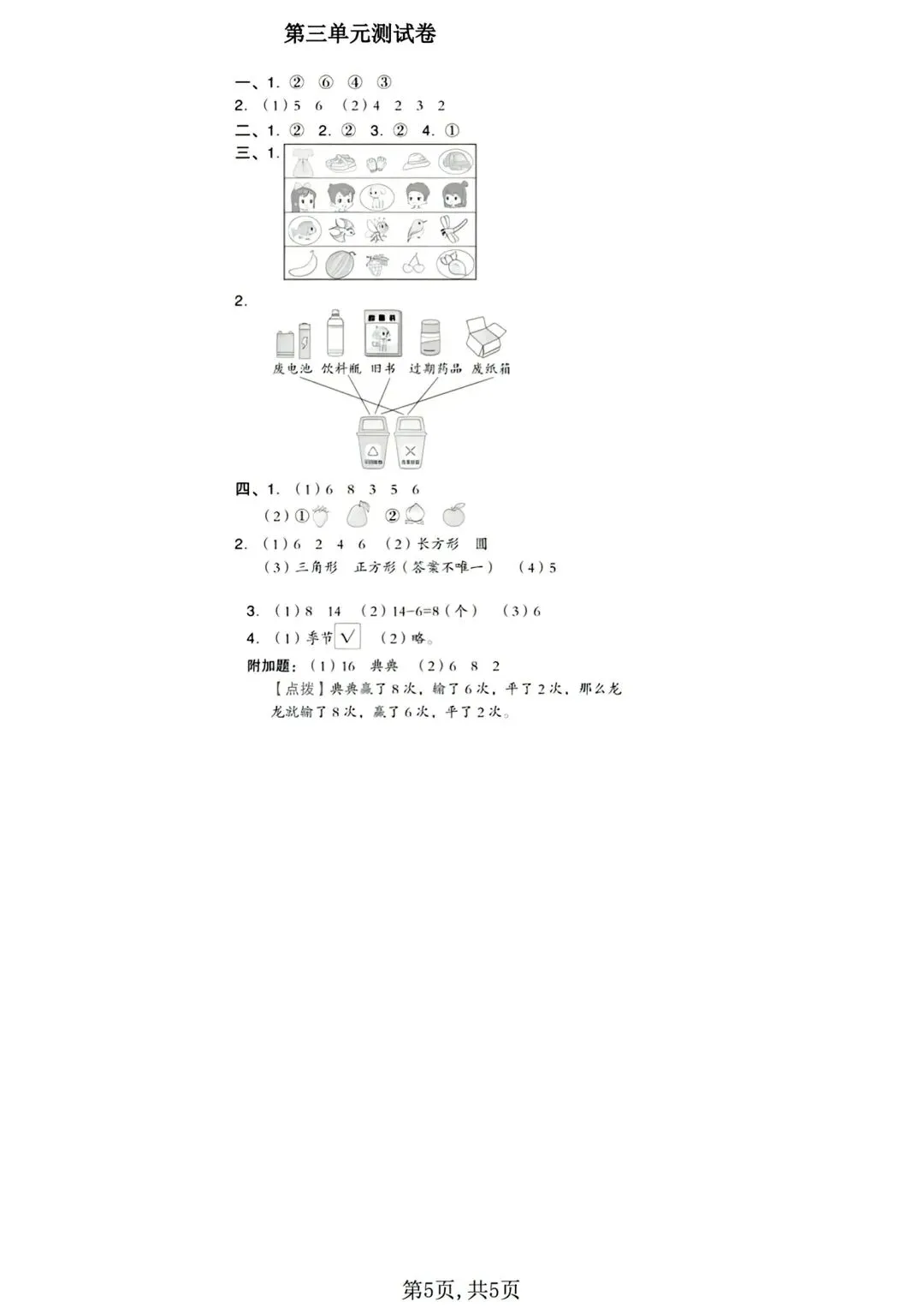 拔尖测试卷增加立体图形判断、分类统计、垃圾分类实操与复杂解决问题,侧重逻辑与应用拔高,适合培优冲刺。