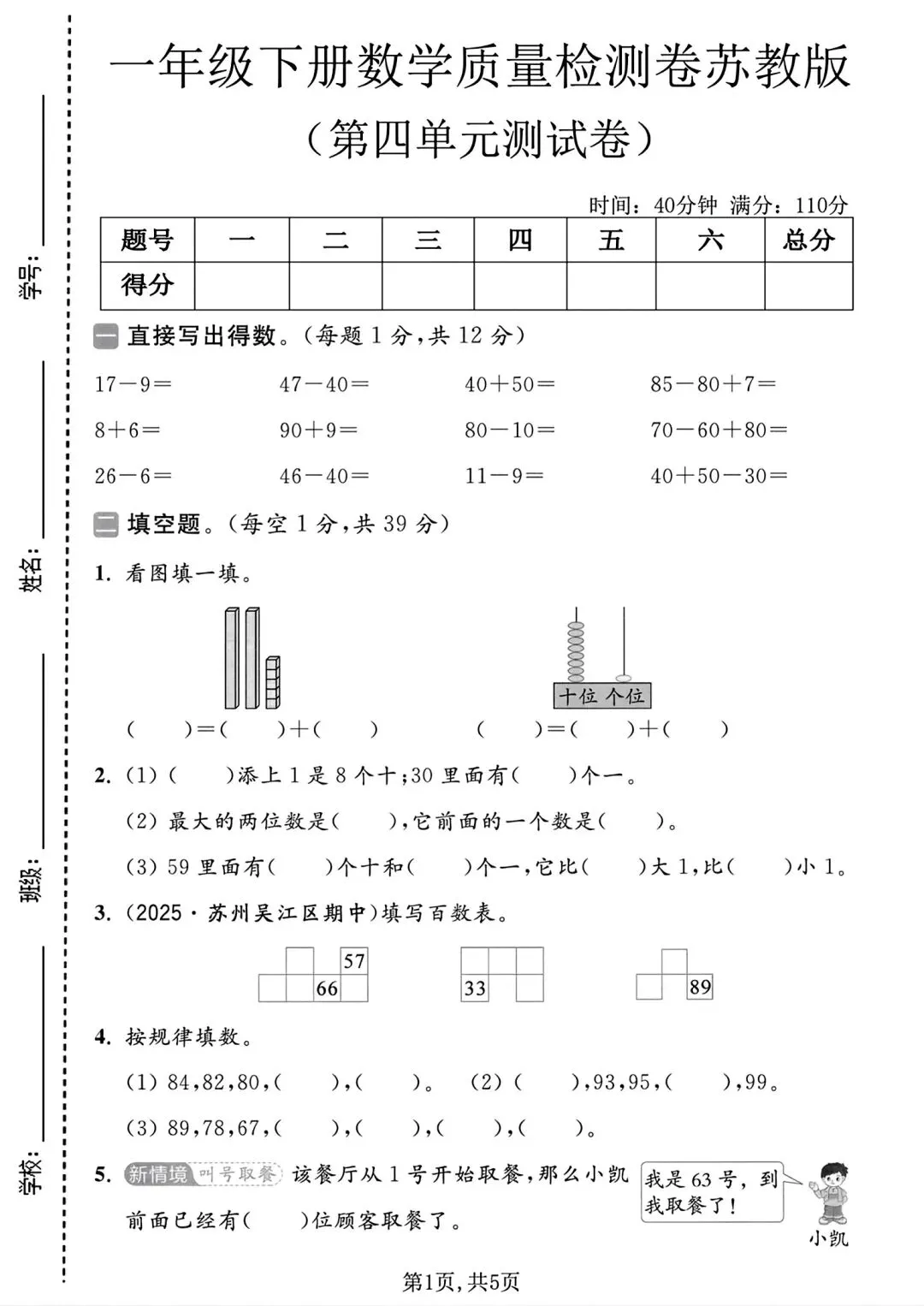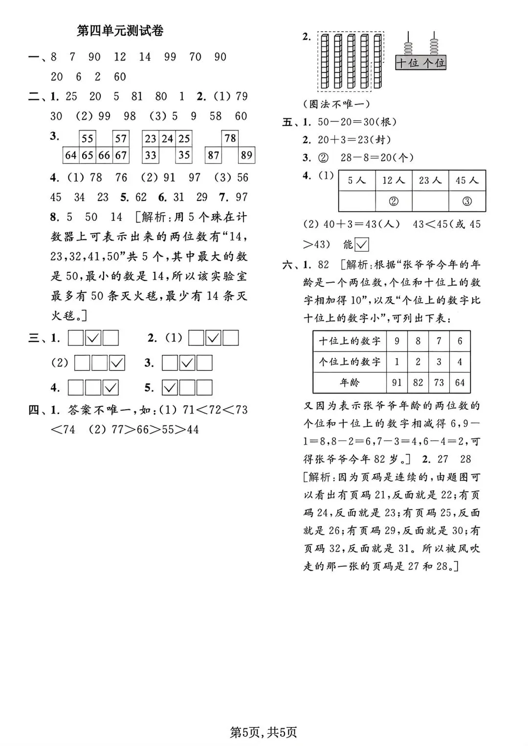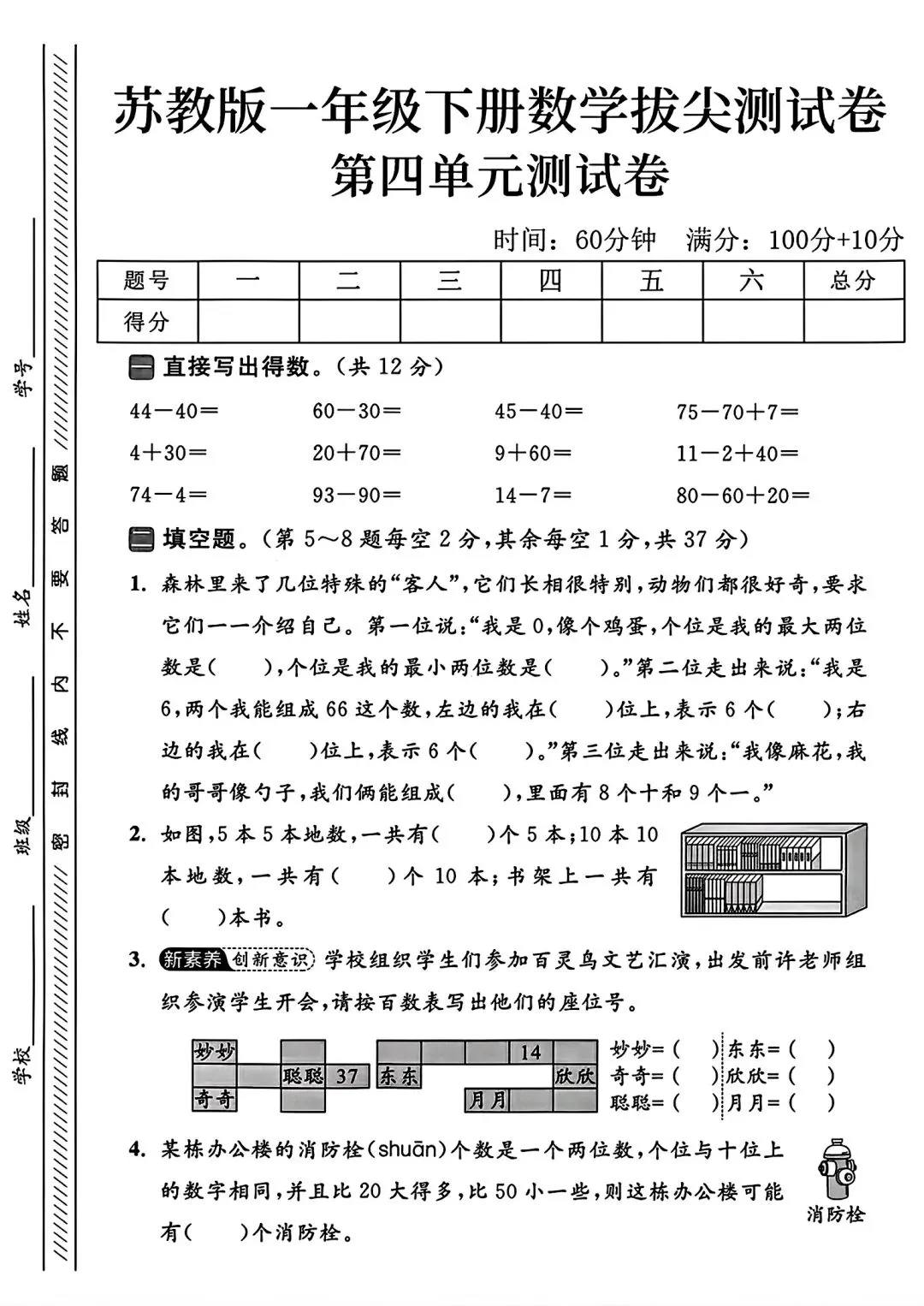 2份苏教版一年级下册数学第四单元试卷考点全面、难度互补。