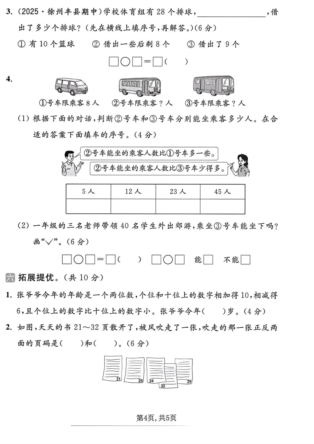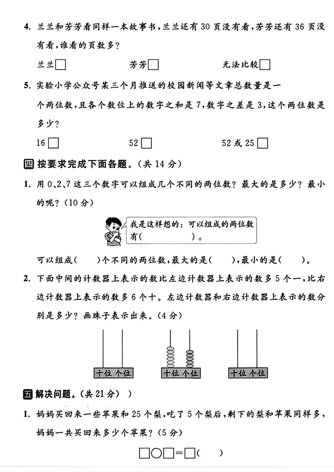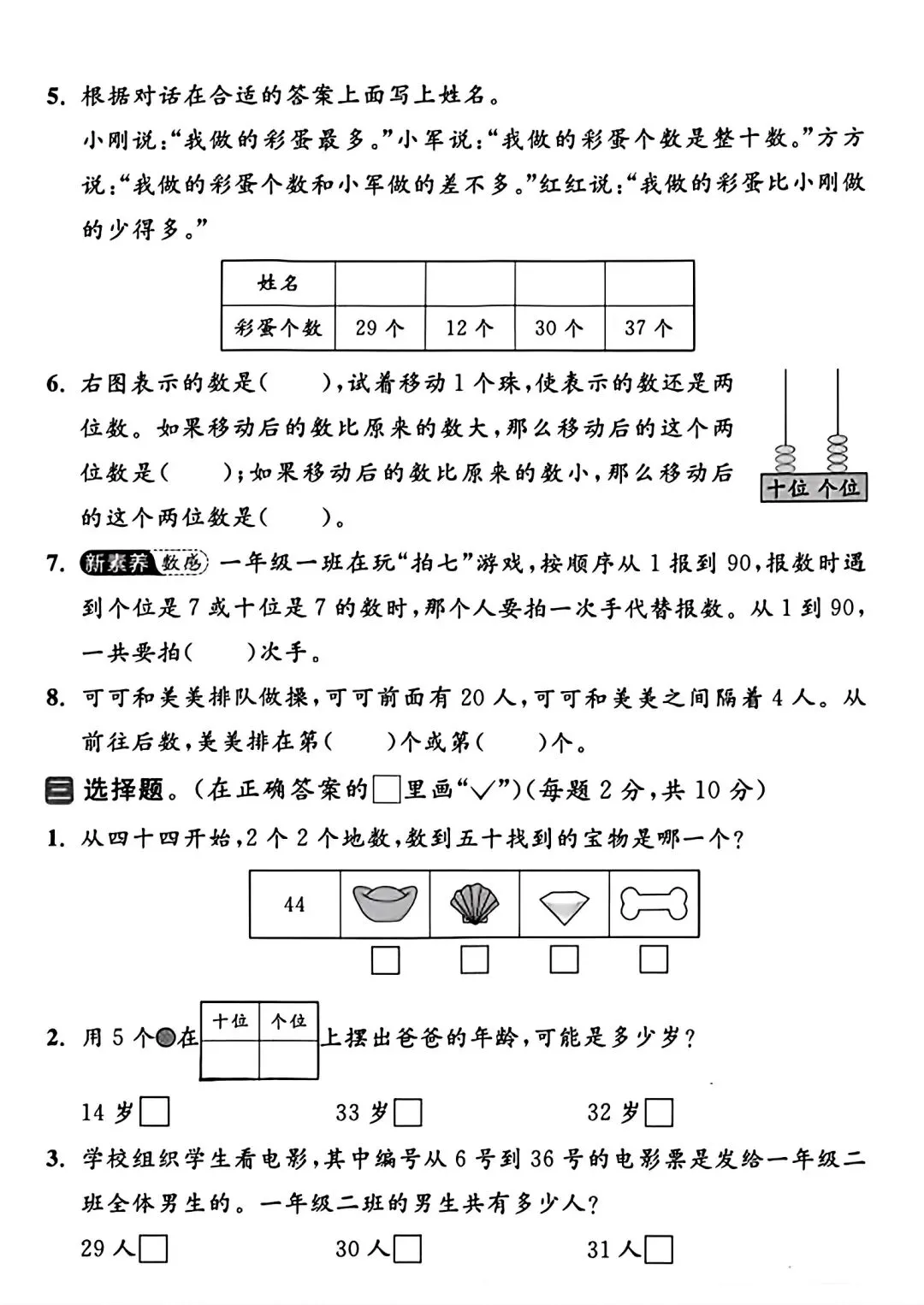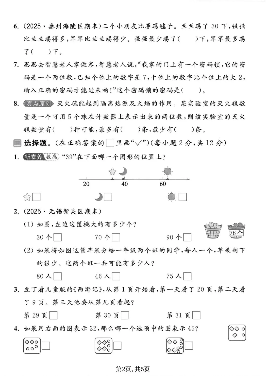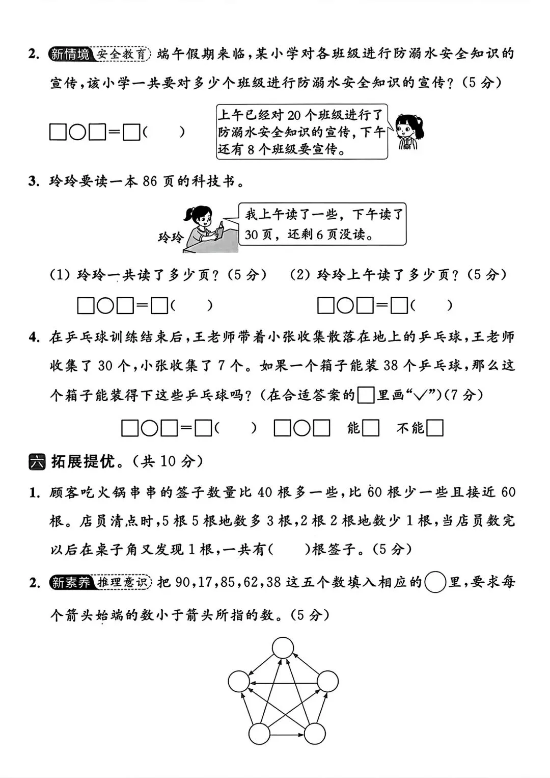 拔尖测试卷增加百数表、规律填数、数字推理、多情境解决问题与拓展提优,侧重思维拔高,适合考前冲刺。