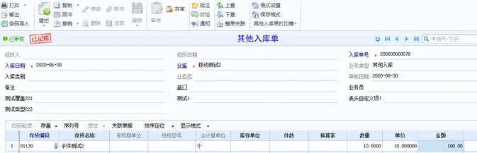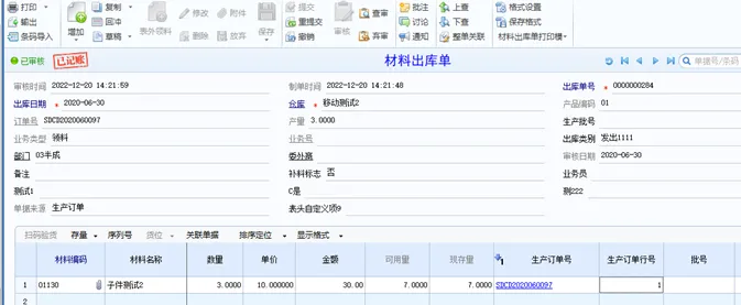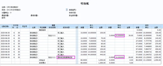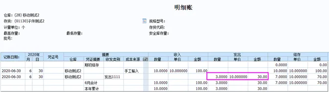 2、做入库单,入库材料10个,单价10。再做生产订单,生产产品3个,领料出库3个,并记账,存货核算明细账中可看到,根据移动平均计价方式计算,材料出库成本为10.