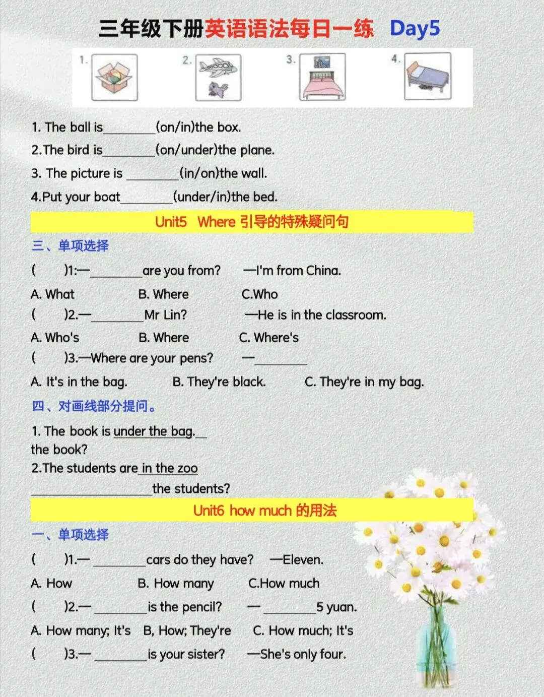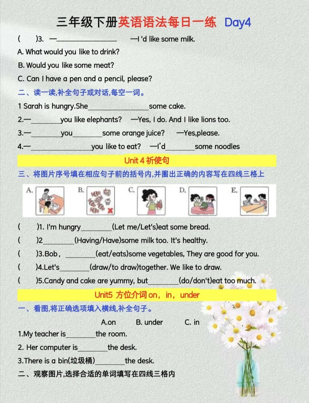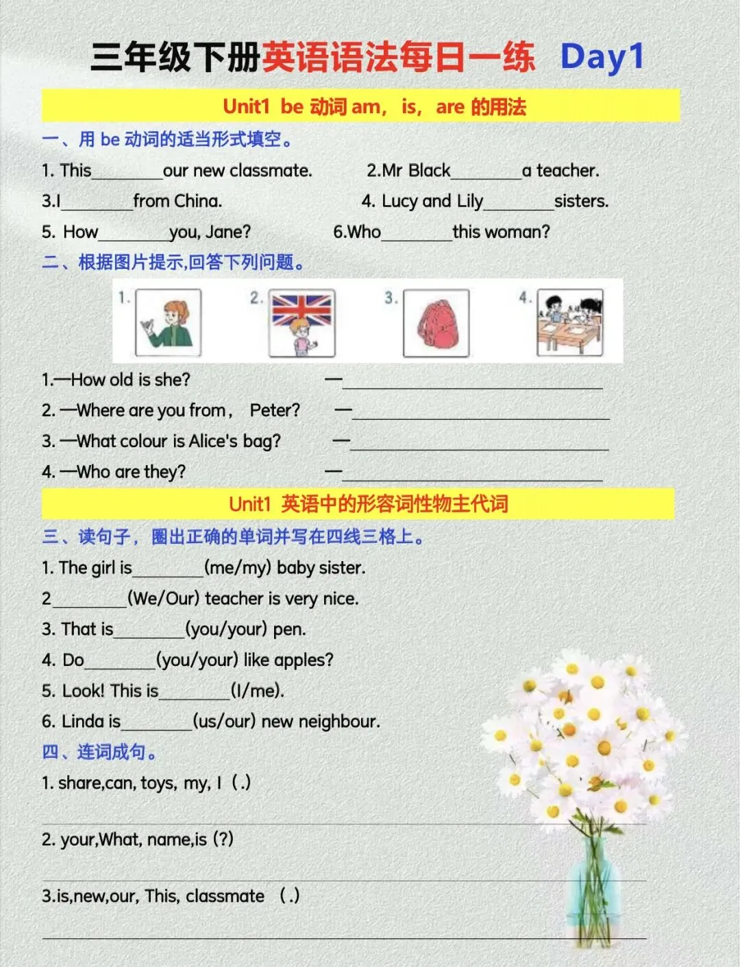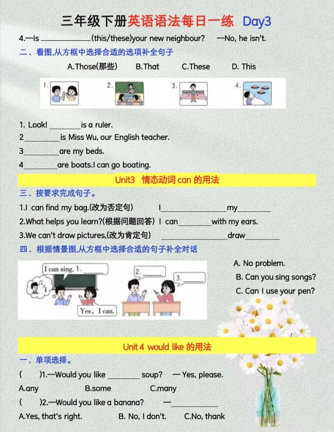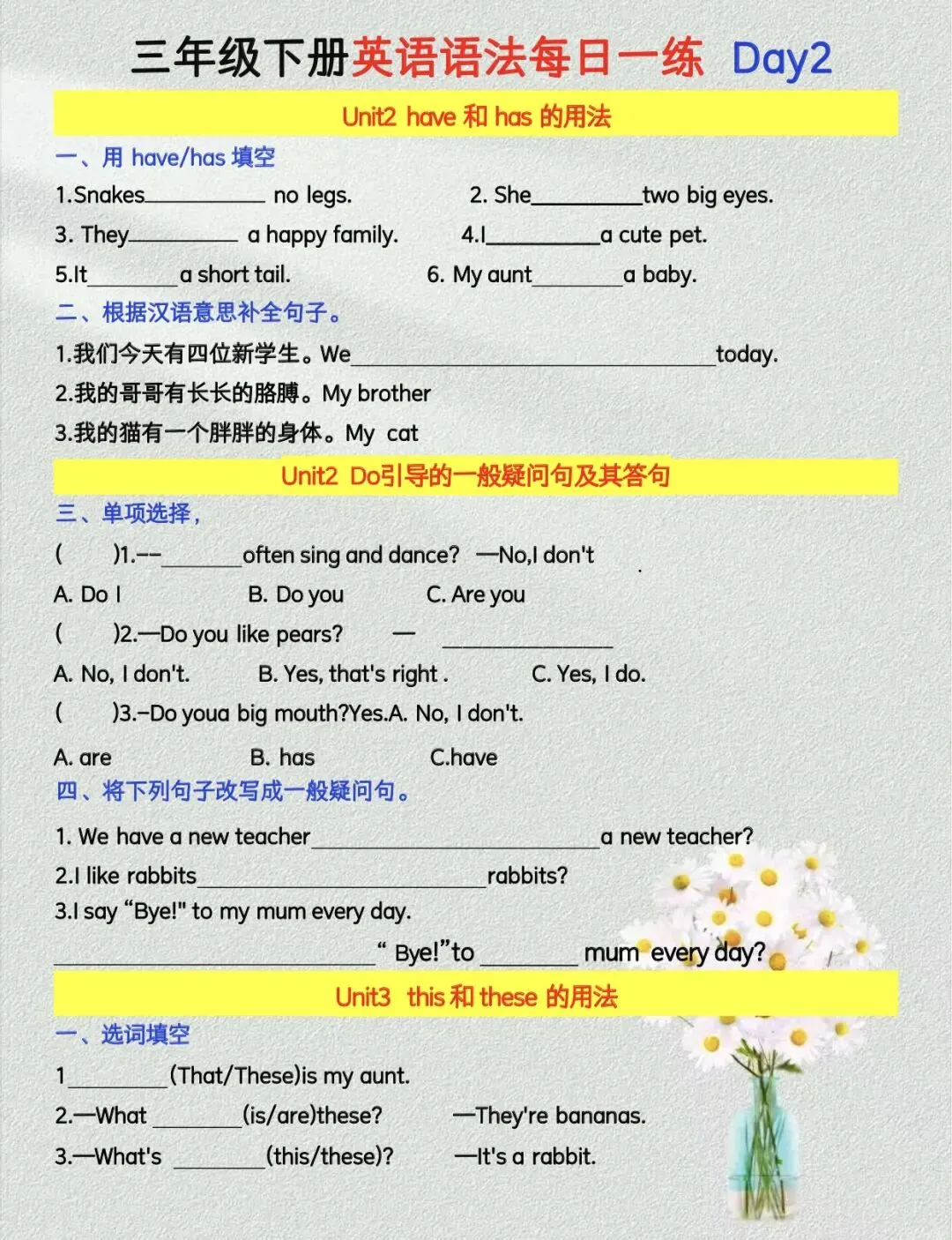 三年级下册英语语法每日一练【人教版】|可打印 以下为部分截图,具体看完整PDF文件 (温馨提示:文末有电子版领取方式) 领取完整电子版: ①:点点右下角的“赞”和“在看” ②:关注公众号点击资料领取按钮