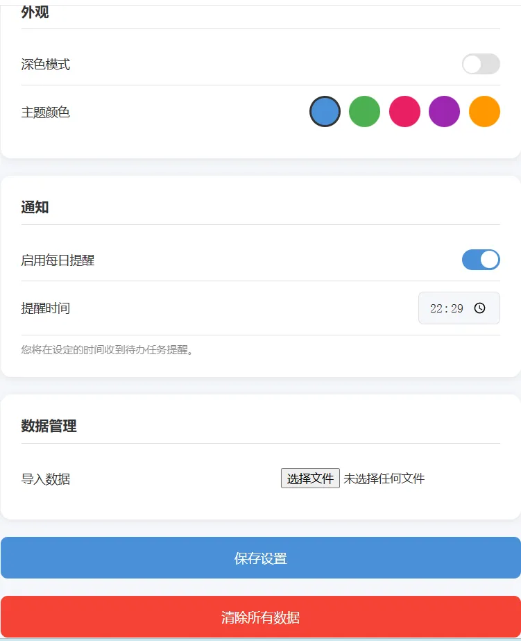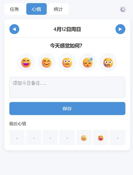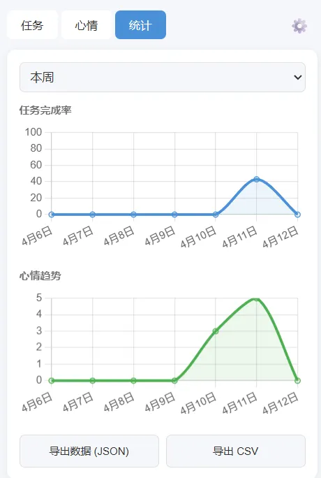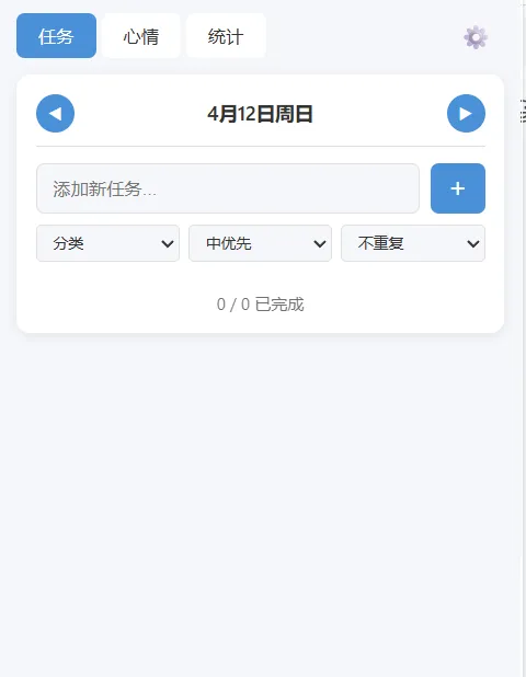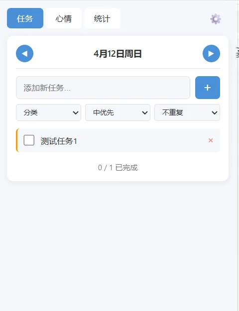 一个每日任务与心情追踪的浏览器插件 这是一个可以管理你每日任务并记录追踪心情的插件工具,支持每日/每周重复任务创建并可以统计数据。 首先打开界面长这样,我们来一一介绍一下。 1、任务面板: 可以根据分类、优先级、是否重复新建任务,页面很简单 2、心情(牛马打工人估计都会😴) |😄 | 兴奋 | 5 | 😊 | 开心 | 4 |😐| 平静 | 3 |😴 | 疲惫 | 2 |😢 | 难过 | 1 | 3、统计 看看你任务完成的怎么样,心情怎么样 4、设置 选选外观、设设提醒、导下数据 就这样
