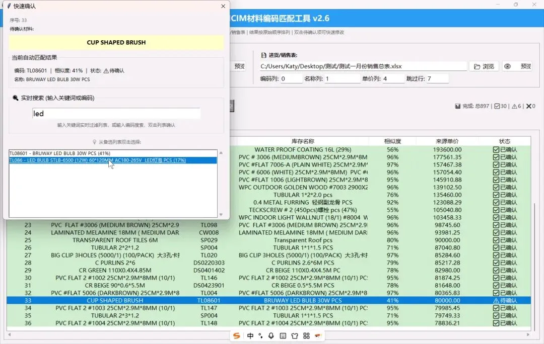 – ✅ 人工复核机制:低相似度自动标黄,双击快速确认