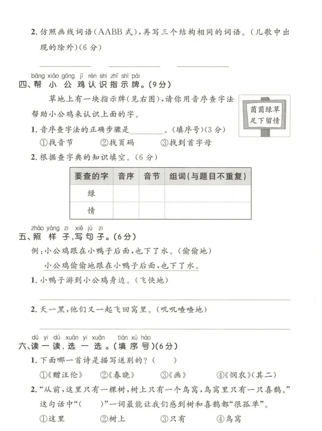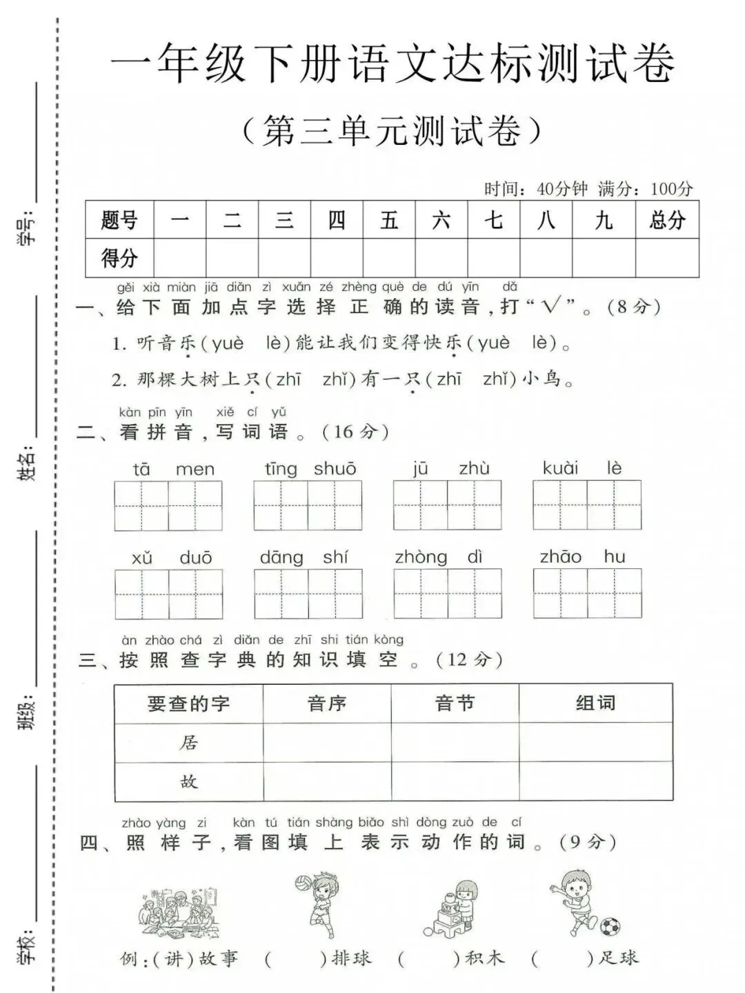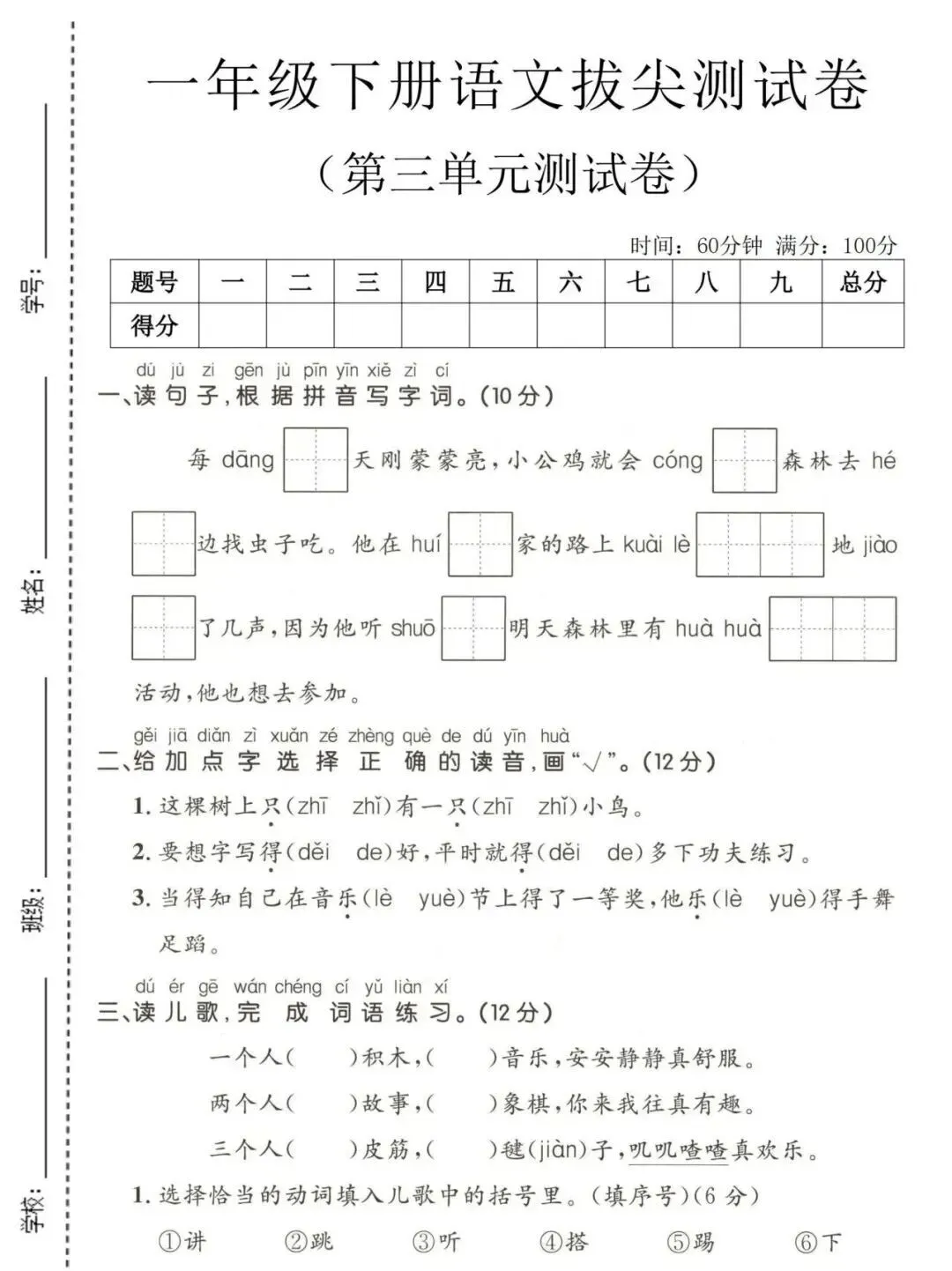 一年级语文下册《第三单元检测卷》2套丨可下载