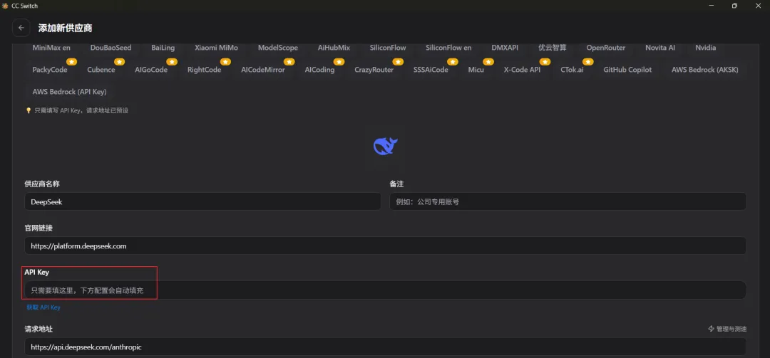 1、添加供应商:打开软件,选择 AI agent 类型,如 Claude Code,点击右上角“+”,选择预设的供应商(如 Claude Official、DeepSeek)或自定义,输入 API Key(请求地址已预设,无需手动填写)。