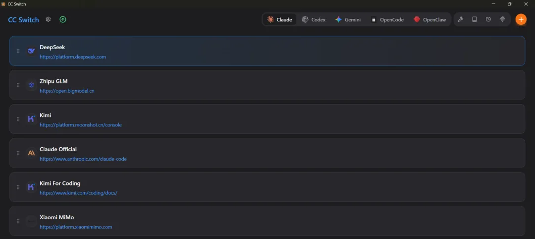 CC Switch 是一款开源的桌面工具(Windows / macOS / Linux),专为管理 Claude Code、OpenClaw, Codex、Gemini CLI、OpenCode 等AI agent的模型供应商而设计。它通过统一的可视化界面,让你一键切换不同的 API 服务商(如官方 Claude、DeepSeek、智谱 GLM 等),同时还能集中管理 MCP 服务器、Skills 和系统提示词。项目在 GitHub 上已获 14.5K Star,累计下载超 130 万次。