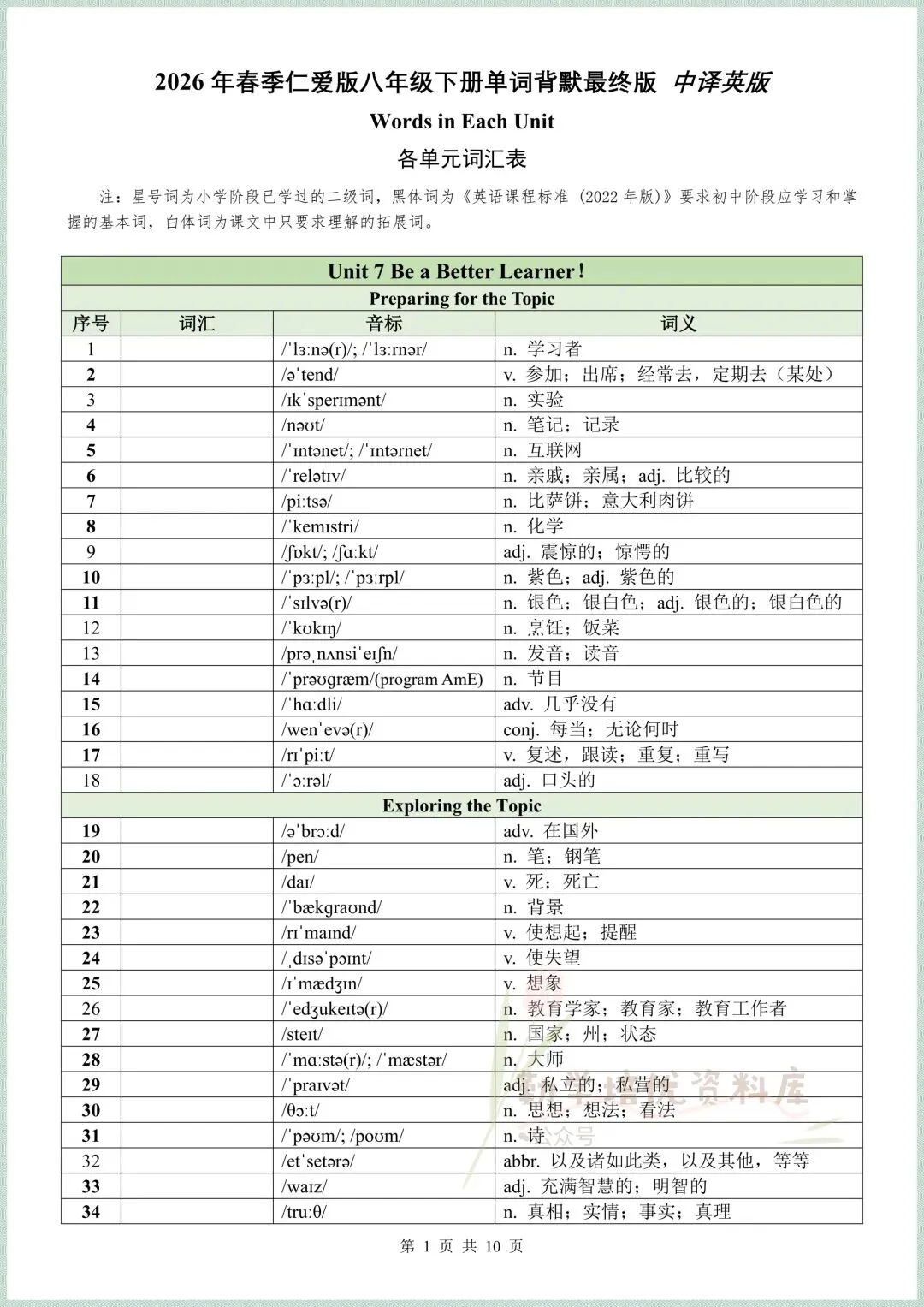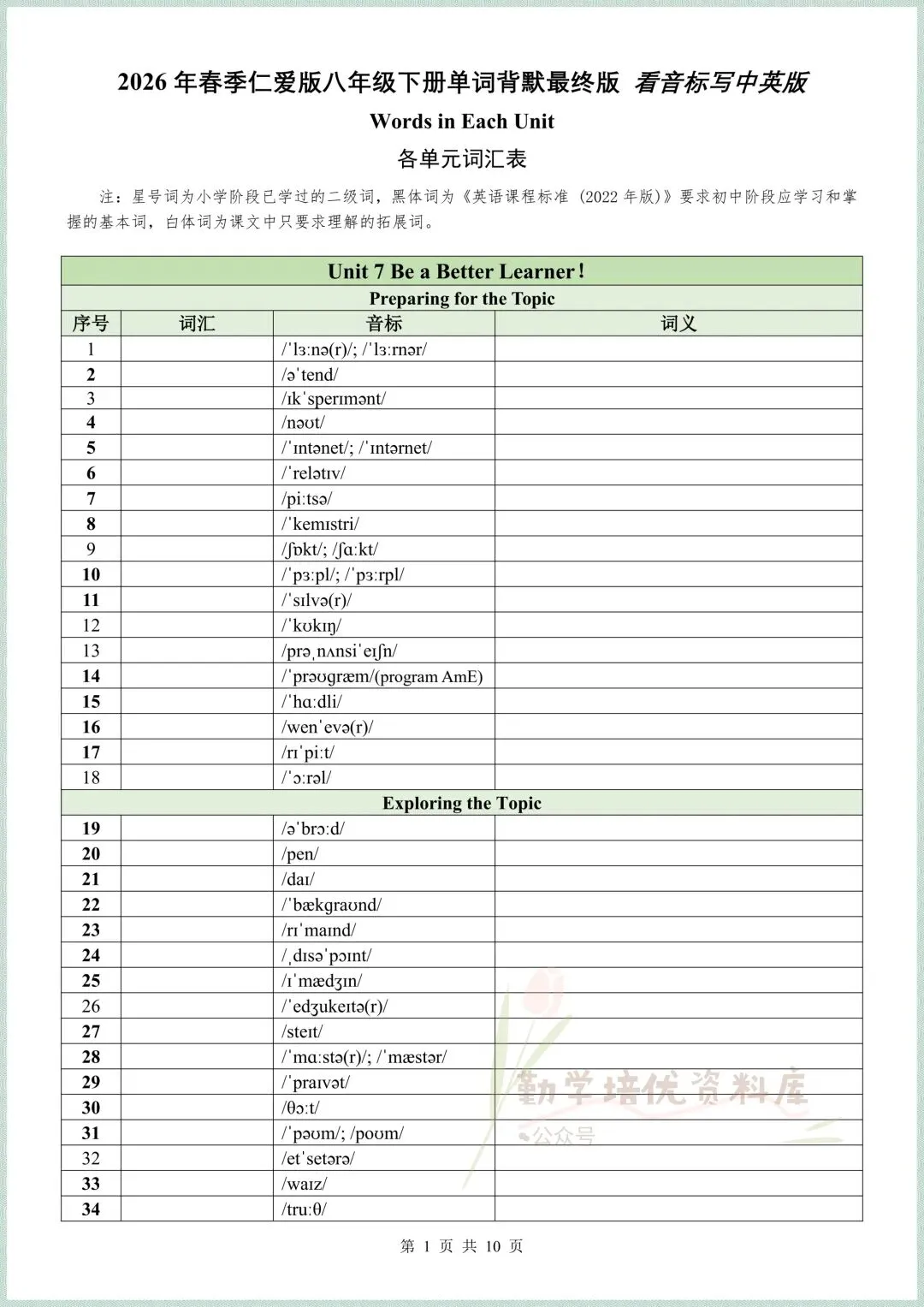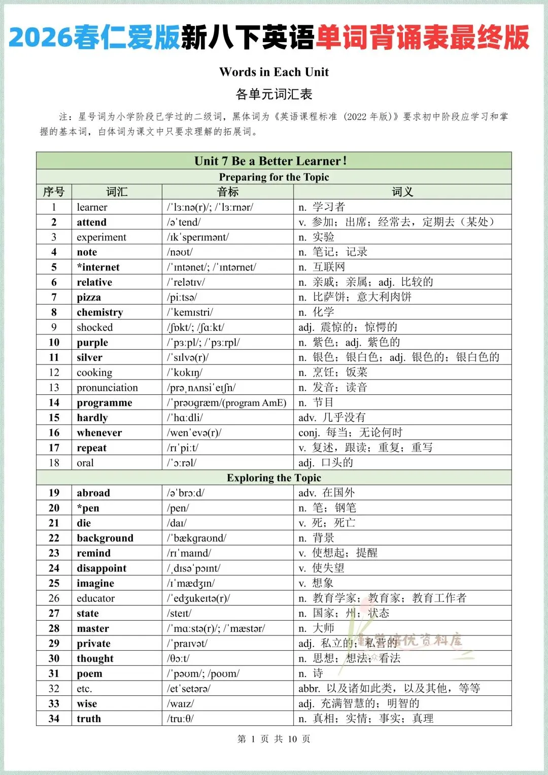 最新定稿|2026春(仁爱版)八年级下册英语全册单词表+短语+句子(背诵版+默写版),可下载打印!