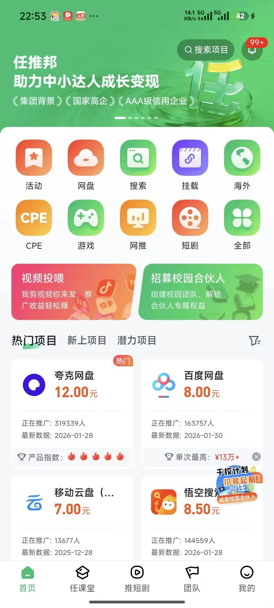 项目齐全,更新快速:除核心网盘拉新外,还有短剧推广、三网号卡、京东外卖、海外拉新等108个热门项目,紧跟行业风口,新项目上线快,推广者可灵活选择,避免单一项目收益瓶颈。