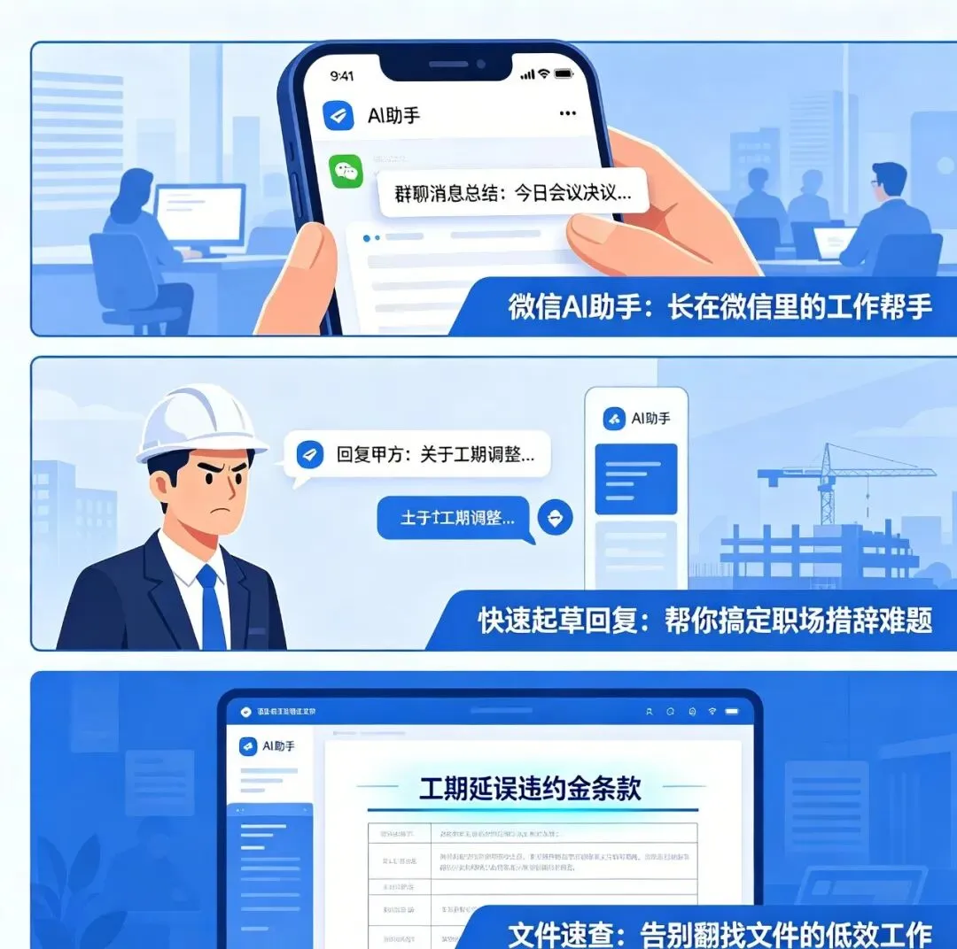 比如施工群里昨晚聊了什么、监理提了什么整改意见、甲方有没有新的变更要求——几秒钟出一个摘要,比我自己翻半小时效率高太多了。
