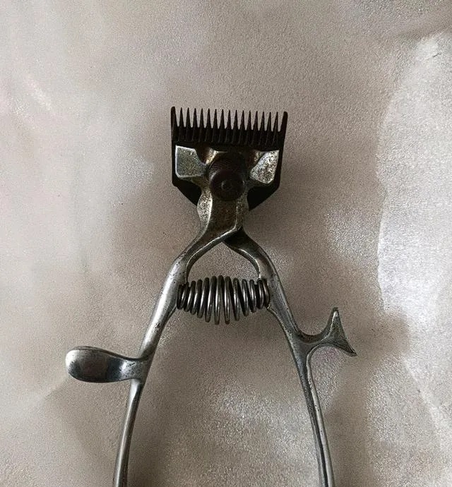 这家伙就是推头机,铁拨叉咔咔响,小时候村头理发师一个大布围上,老爷子左手按头,右手推刀,一下一下把后脖儿皮都带起鸡皮疙瘩,爸说那个声音跟割草似的,电动推子一换,手劲活儿全没了,现在这东西翻出来顶多让孙子当玩具。