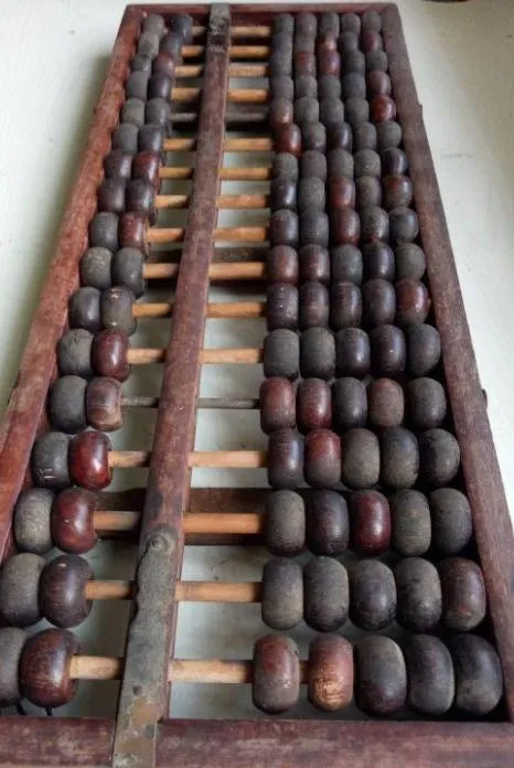 这个老算盘枣核珠子沉甸甸,珠子拨起来啪啪响,买卖账、过年分东西都用算盘算,奶奶指着珠子教我:“这是一,三下四上”,现在谁还会用这个,计算器、手机一摁就得。