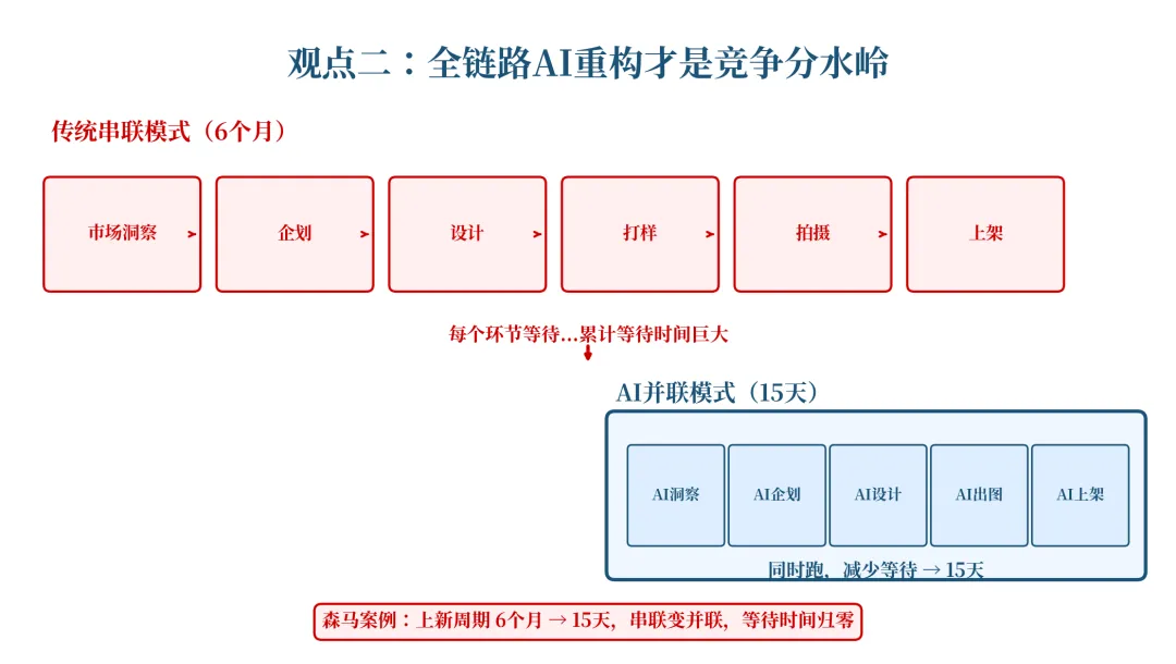 串联变并联,等待时间归零,是上新周期从6个月压到15天的核心逻辑。不是某个环节快了,是整个时间结构被重构了。这意味著,单点AI工具用得再好的企业,如果没有全链路思维,正在被悄悄拉开差距。