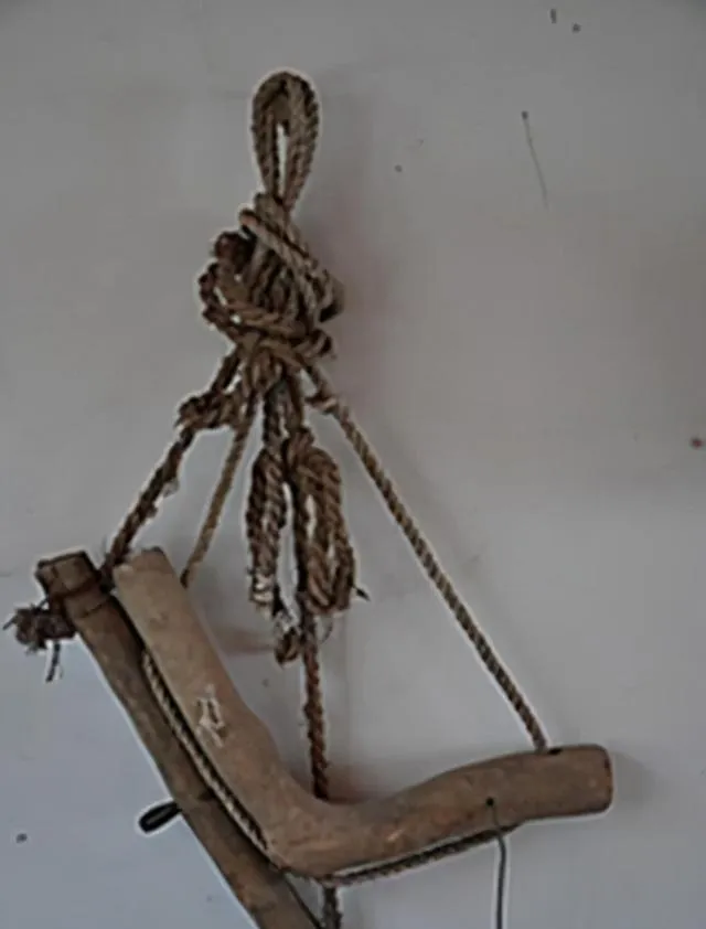 这个木头Y型的是犁田农具,拴着麻花大粗绳,全靠力气活着,爷爷说,“这牲口头上的‘领子’,没它还真不成”,印象里一到春耕,牛脖子上一架,爬满泥浆,炮仗一样的喊声远远地,两个壮汉齐上阵往前拉,地里全靠牛马带着人,棉袄袖子撸到手肘,每年只这几天才用,老物件放家墙角,一年见不了几回。
