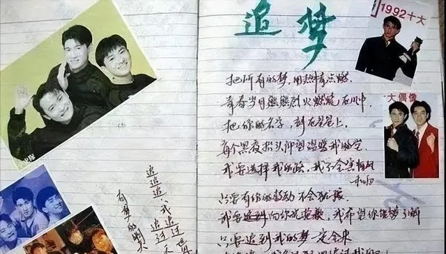 这个花花绿绿贴照片的本子叫抄歌本,八九十年代流行歌一来,班里小孩全迷进去,歌词一点点抄,有错别字也没人管,追星族的入门级工具,张学友刘德华都上墙头,本子里最常放的是班级最热门的那几首,每天换着写,边涂边画,还能偷空夹点演唱会票根,同学想借还得排队,回头一翻,写得乱七八糟却不舍得扔。