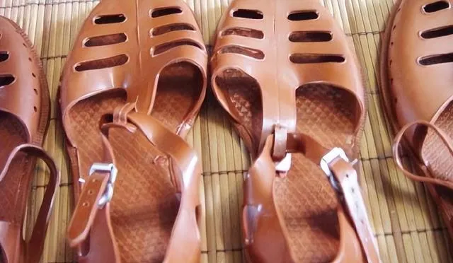 最后要说的这个棕黄色的是老式凉鞋,南方人管它叫“塑料拖”,小学人人一双,进校暑假脱了鞋晾脚丫是标配,塑料带子一踩别提多结实,夏天下雨踩一脚泥没得怕,鞋子花纹小时候也背过,妈妈说“别穿烂了难换”,旧鞋留着补种菜用,一双凉鞋能穿三年,暑假必备神器。