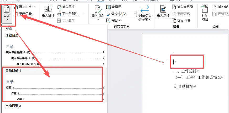 把鼠标光标移到文档最开头的位置,就是你想放目录的地方(一般是文档第一页的最前面)。点击 Word 顶部的【引用】菜单,在左边找到【目录】按钮,点击一下。在弹出的菜单里,选择【自动目录 1】或者【自动目录 2】,随便选一个都可以,点击一下。点击后,Word就会自动生成一个完整的目录,里面有你设置的所有标题,还有对应的页码,完全不用手动打字。