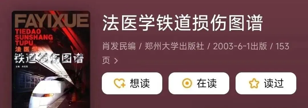 《法医学铁道损伤图谱》(肖发民 主编,郑州大学出版社 2003 年 6 月出版,ISBN:978-7-81048-761-0)受《中华人民共和国著作权法》严格保护。本书仅限专业人员在法医鉴定、事故调查、教学研究等场景使用。书中含大量真实损伤照片,不适宜非专业人士阅读,严禁任何形式的非法传播、转载及商业使用。