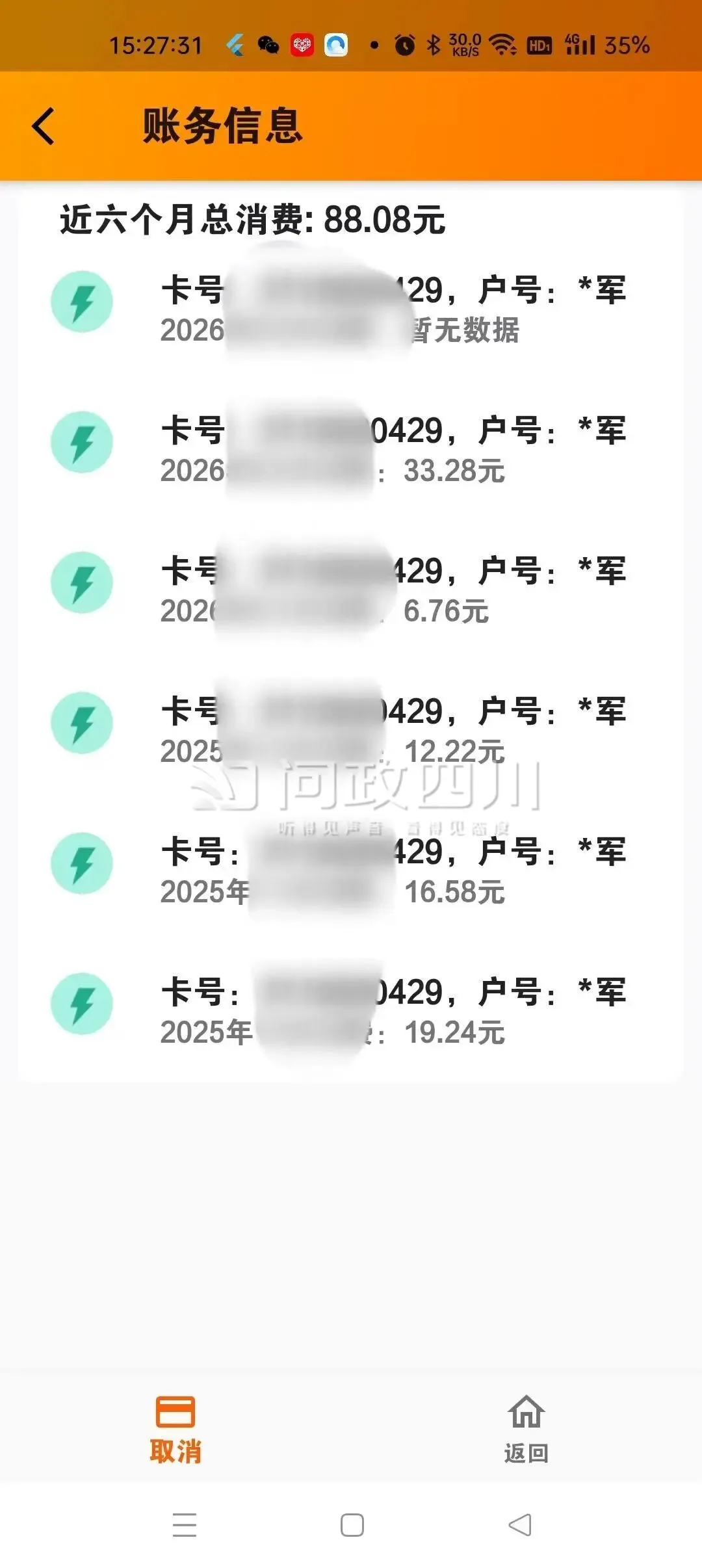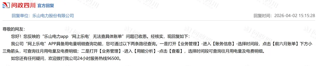 近日,有市民在问政四川反映,乐山电力“网上乐电”APP首页账务信息中,只能看到每月总账单金额(如33.28元),无法查看具体用电量。而通过“乐电通”微信页面才能查询,操作不便,希望改进。