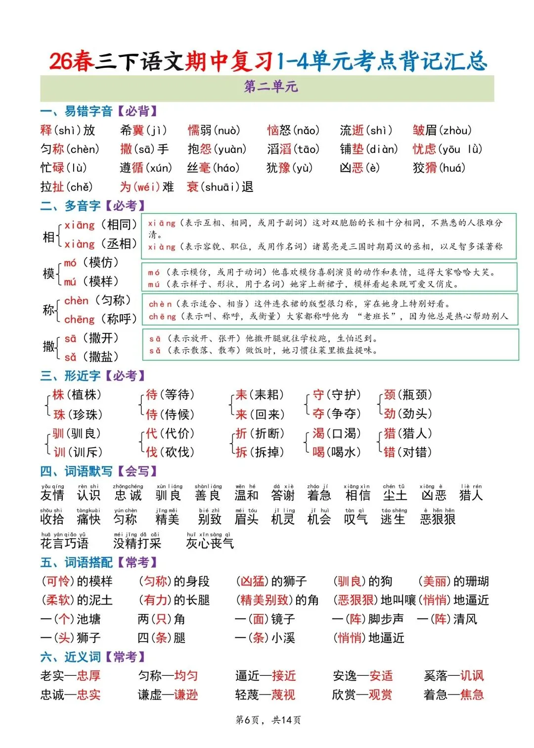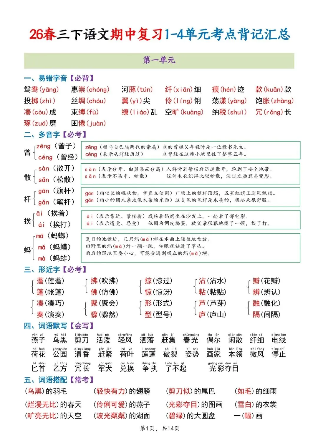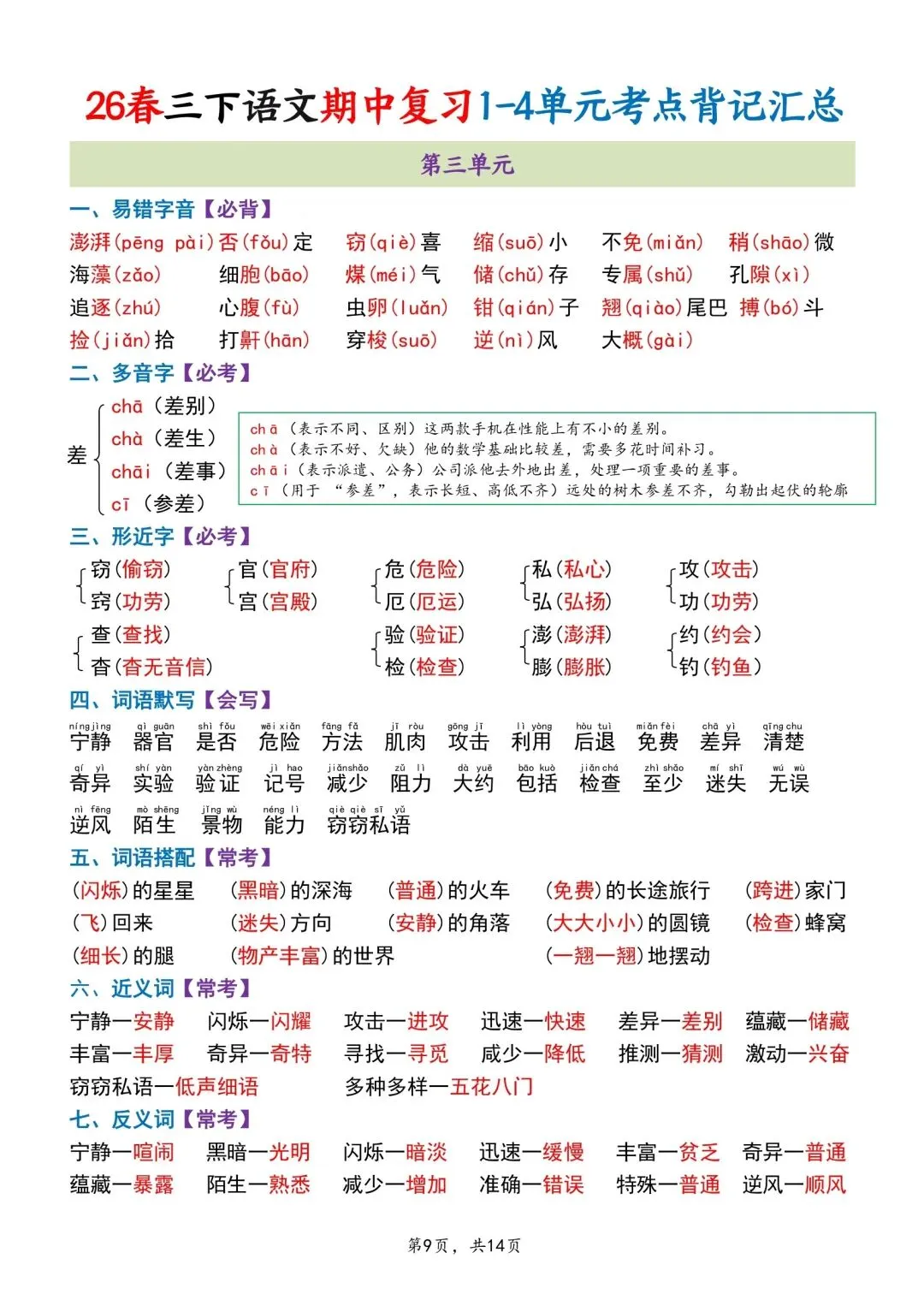 三年级下册语文期中专项归类卷含答案可打印