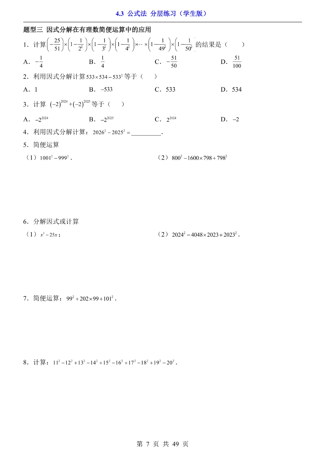 【八年级下册数学】【北师大版】4.3 公式法~分层练习附解析—高清可打印