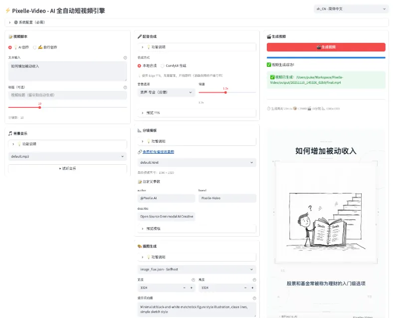 它能干什么: 你只需要输入一个主题(比如”为什么要养成阅读习惯”),AI会自动完成所有事情——写文案、生成配图、合成语音解说、加背景音乐、最后合成完整视频。