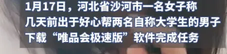 1月17日,河北省沙河市一名女子称几天前出于好心帮两名自称大学生的男子下载“唯品会极速版”软件完成任务
