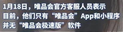 1月18日,唯品会官方客服人员表示目前,他们只有“唯品会”App和小程序并无“唯品会极速版”软件。