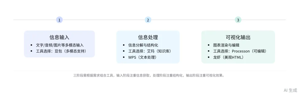 课程方法论清晰:AI完成工作可拆为输入、处理、输出三阶段,核心工具采用豆包、Processon、WPS、ima、龙虾五种基础工具,并实现根据工具性能完成组合。