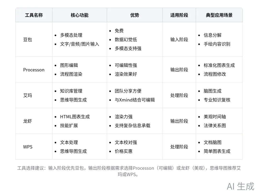 豆包为免费工具,具备多模态输入能力,可处理文字、音频、图片。虽然当前不支持视频输入,但支持视频输出。整体幻觉率相对较低,在信息采集和前处理阶段表现稳定。