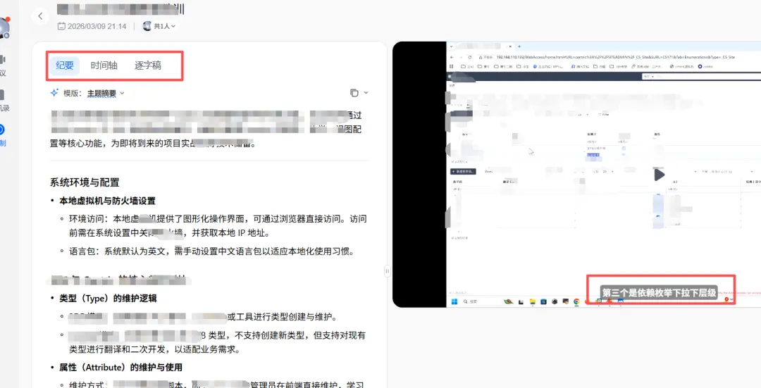 这个主要是在腾讯会议上用的,功能和飞书会议也差不多,可以根据你的讲话,来归纳总结出会议纪要,也可以查看讲话原内容,并且可以按时间轴查看,功能和飞书高度雷同,配合录屏来看更好一些。