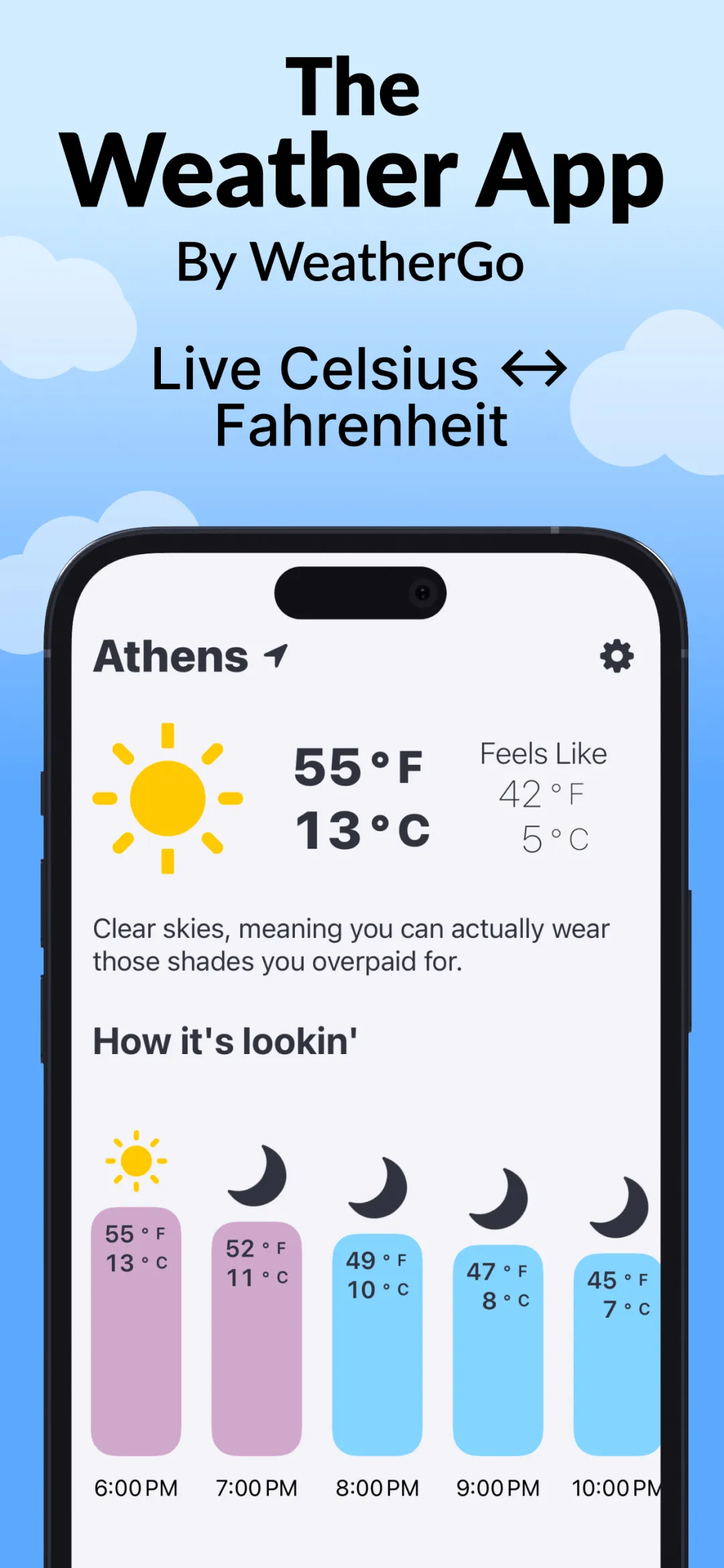 你是一位在国外生活或旅行却不知道 15 摄氏度的天气是热还是冷的美国人吗?或者你是一位在美国生活的外国人,却好奇为什么 25 度还会下雪? 好吧,不用再为此伤神了,WeatherGO 已帮你解开了心中谜团!WeatherGO 可根据实时天气进行温度转换。